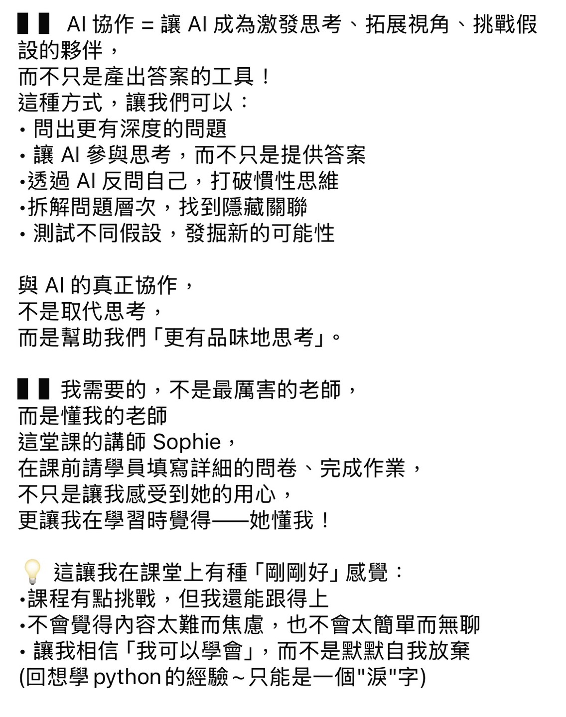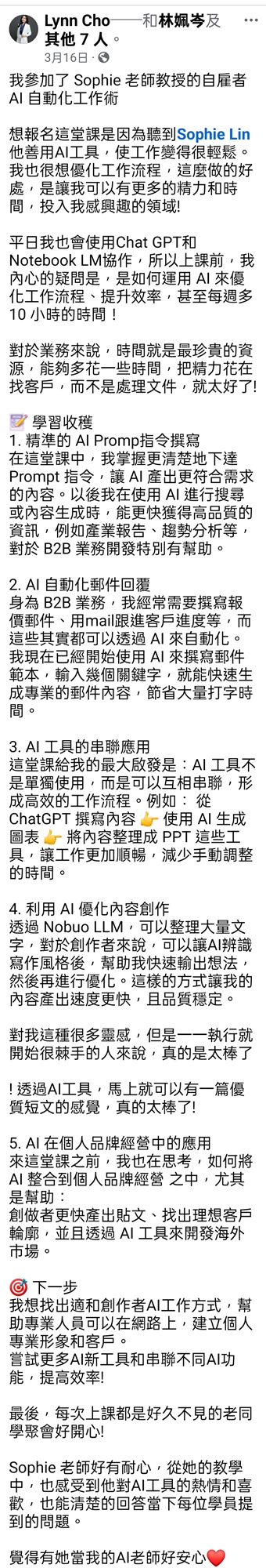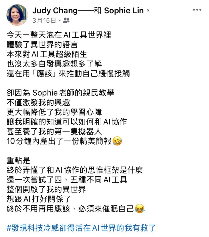 • 我帶領過超過 100+ 的學員與企業團隊,真正把 AI 技術落地在行銷、寫作、專案管理、教學…等不同領域