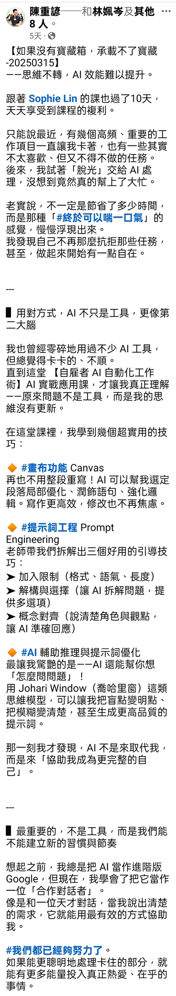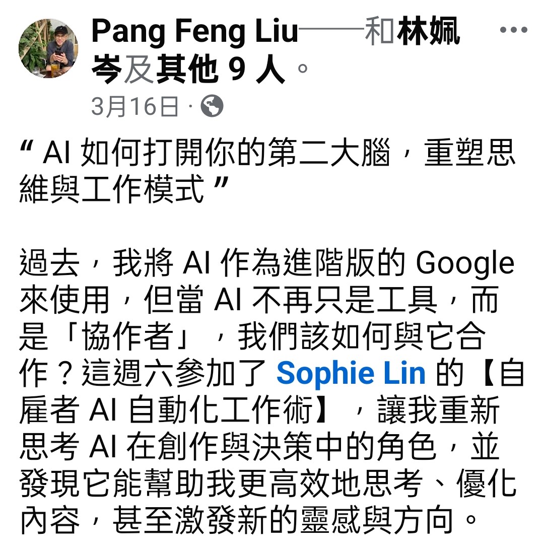 現在的我,每週至少省下 10 小時:用 AI 幫忙產出內容、規劃課程、撰寫會議大綱、整理產品文件;