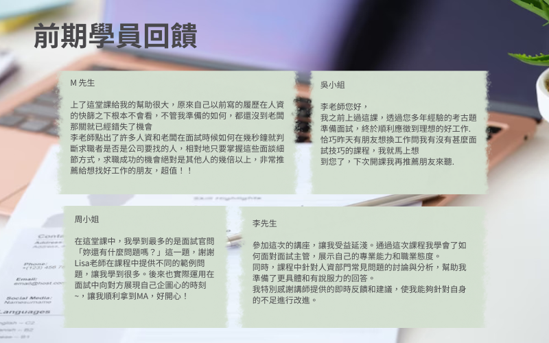 Lisa教練30多年HR經驗,以往都是教主管如何面試人選,現將從HR專業視角,揭露那些面試的真相,並教你如何從面試官的思維準備面談。無論你是職場新人還是準備跳槽的資深工作者,都能在課程中獲得實用面試突圍4+1手法,凸顯你的優勢讓你少走彎路,順利拿到offer。