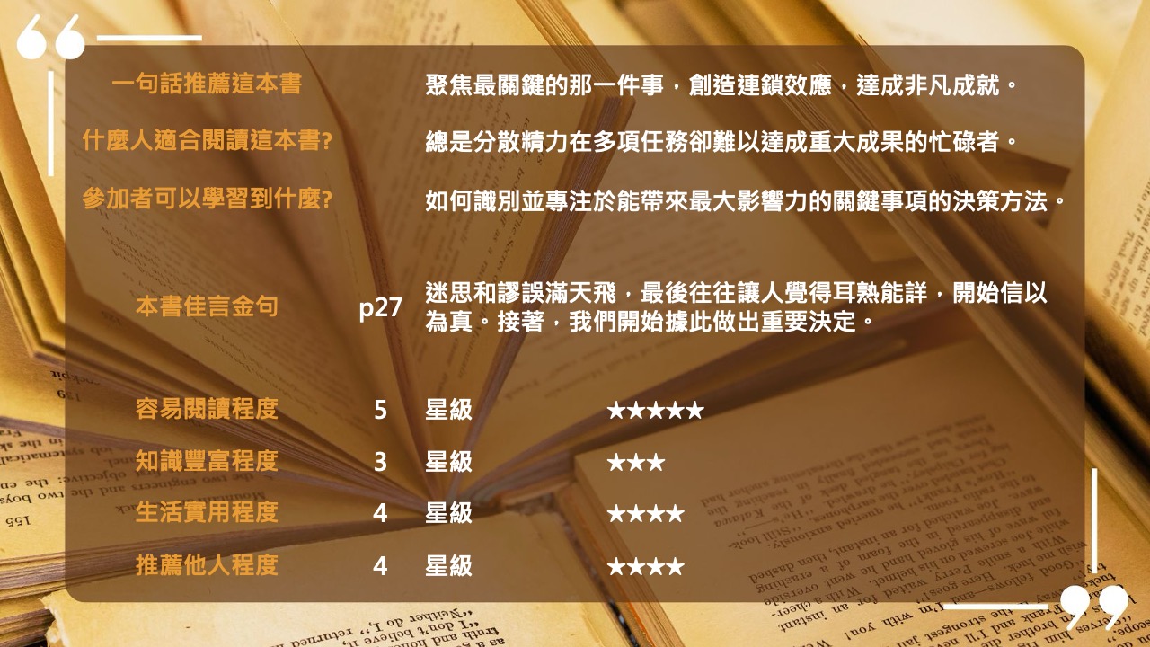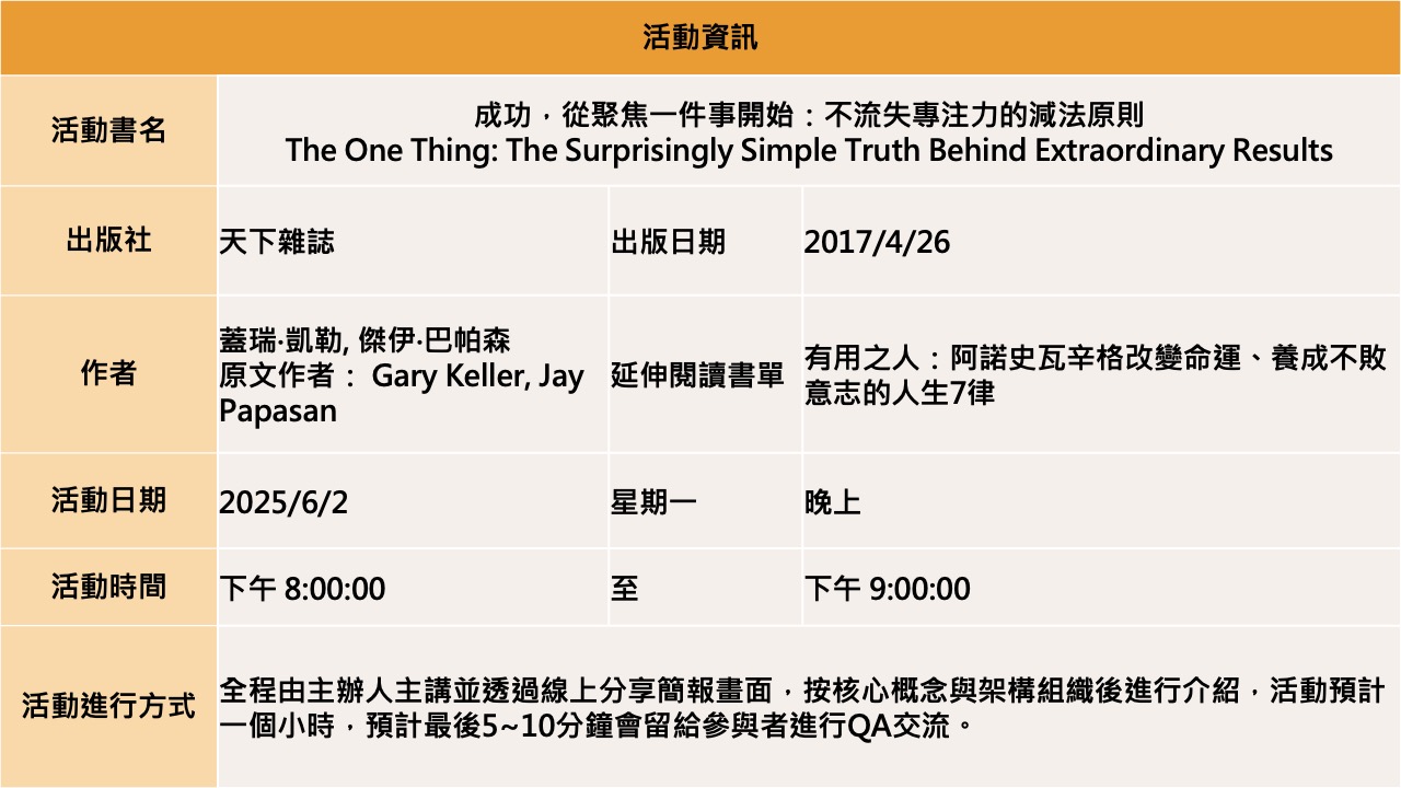 【BookBook預約線上讀書會】成功,從聚焦一件事開始:不流失專注力的減法原則