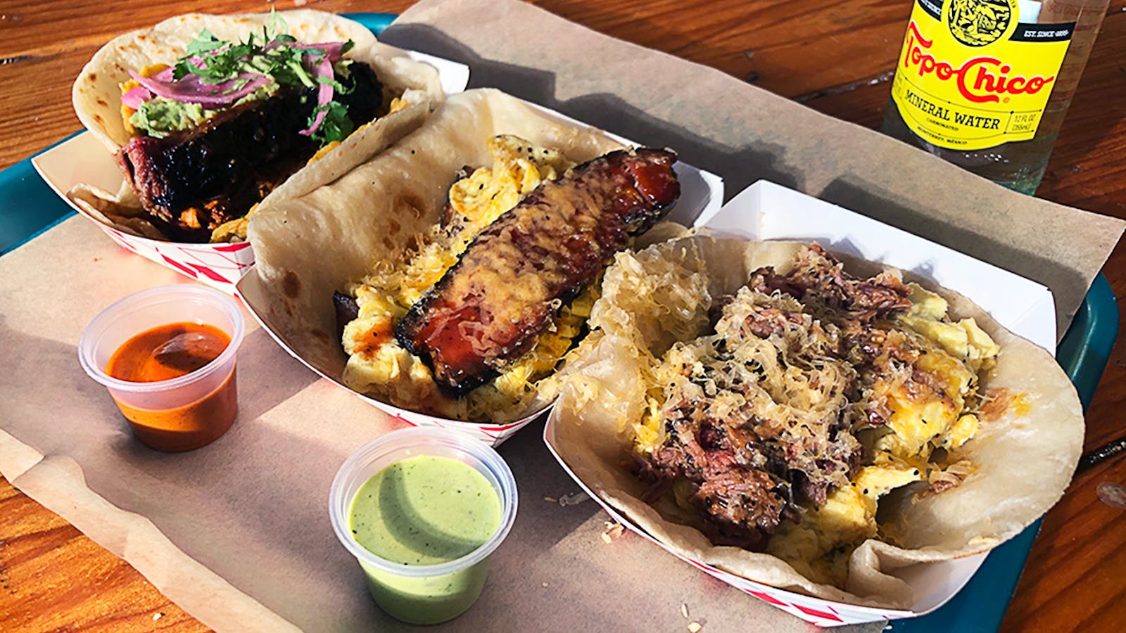 來自美國西岸的創新風味:煙燻BBQ肉品搭配韓式泡菜沙拉與特製莎莎醬,包裹在熱騰騰的玉米餅中。