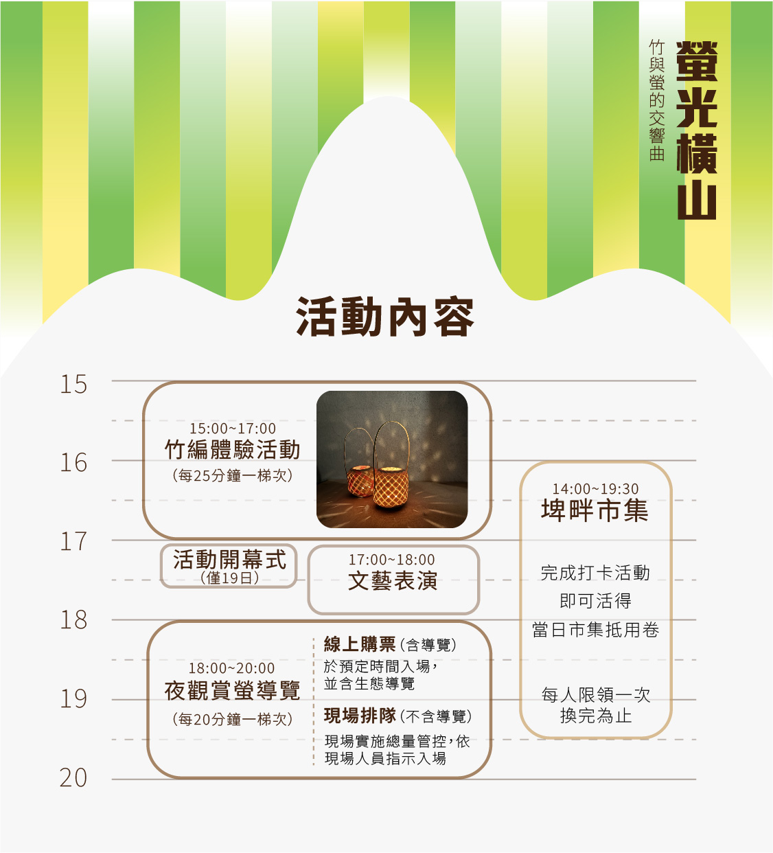 - 請務必於「賞螢生態導覽」開始前10分鐘完成報到,如未準時完成報到,其名額及竹編手作成品(如未製作)則開放現場候補,恕不保留。