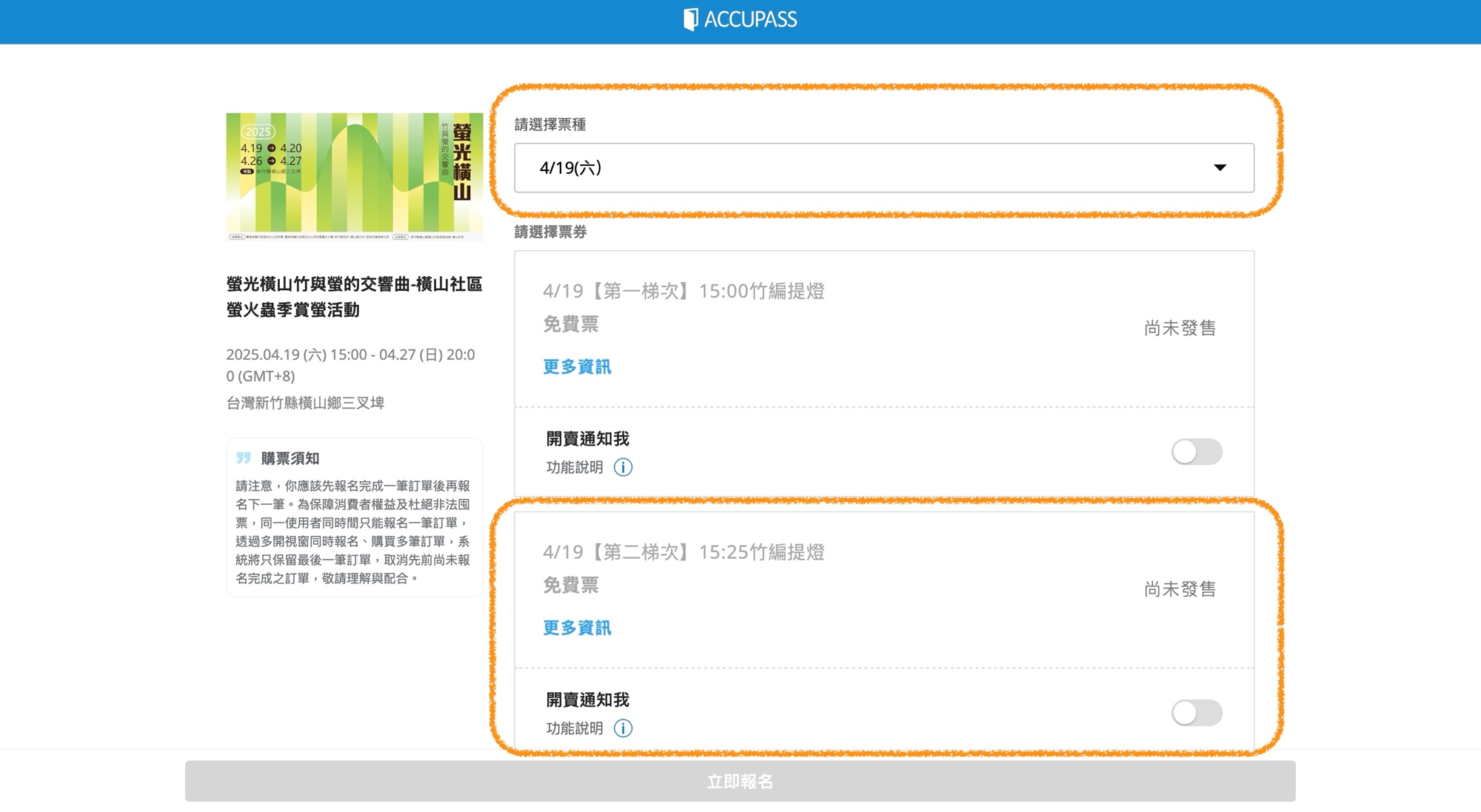 - 選擇「活動日期」及「竹編手作場次」,並依系統指示完成訂票。