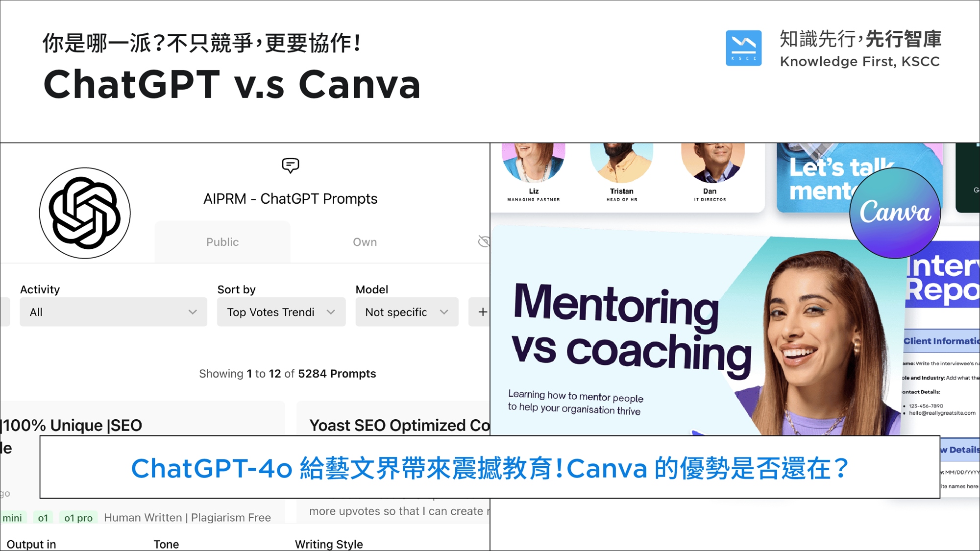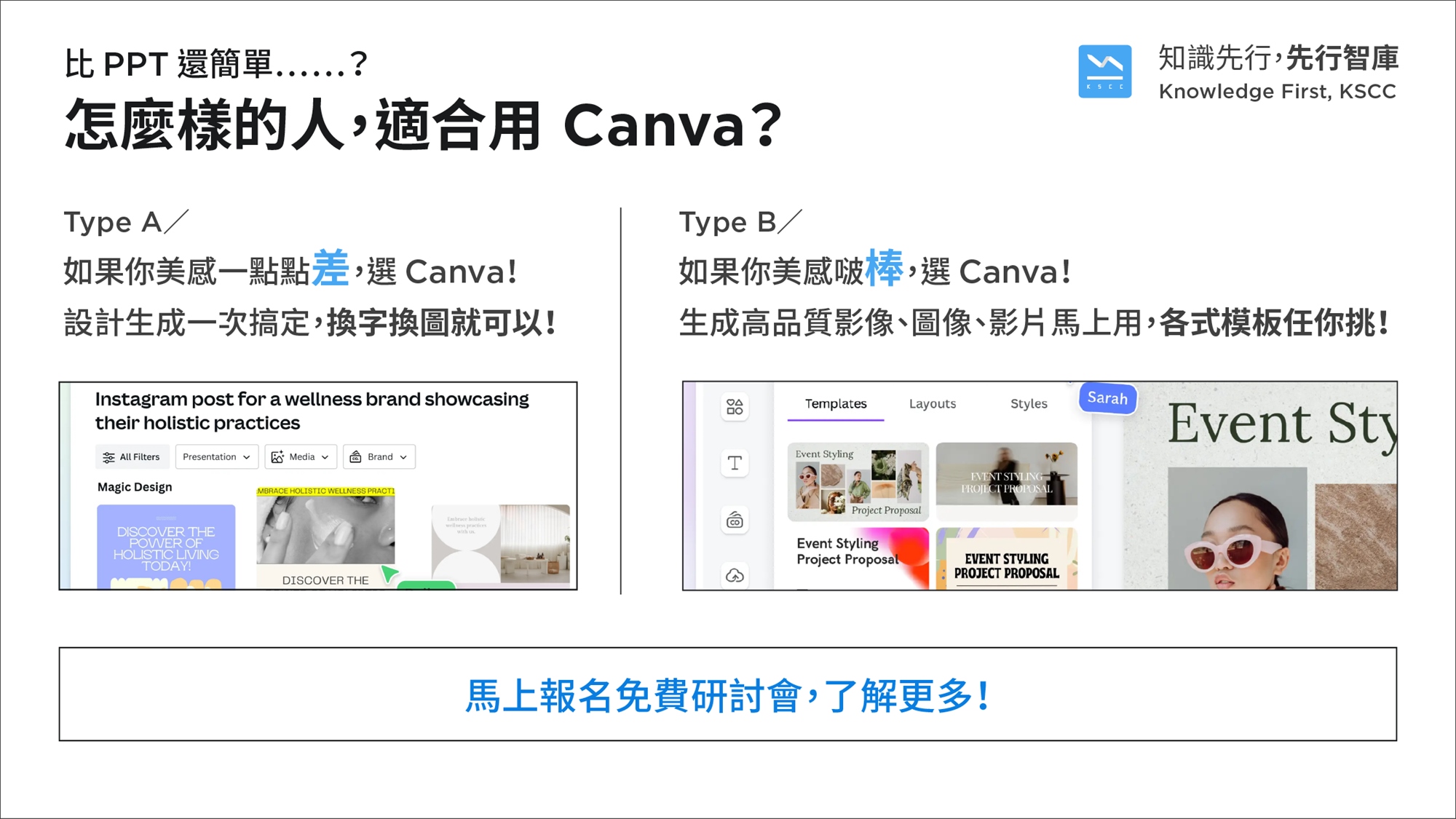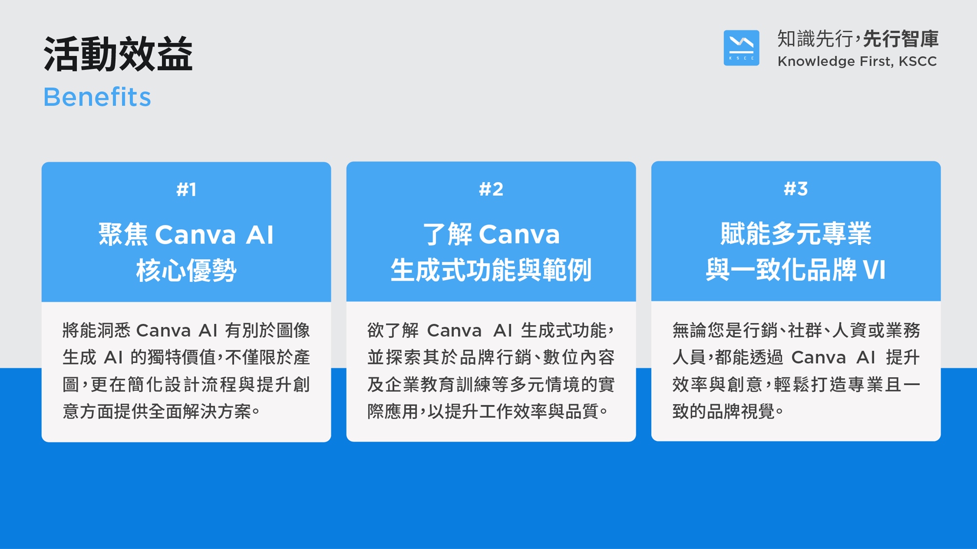 隨著 ChatGPT 生成圖片技術的躍升,是否還需學習 Canva AI 等生成式設計工具引發討論。本次研討會將探討兩者在產圖與應用上的差異,並展現 Canva AI 在品牌行銷、內容創作、企業教育訓練教材製作等方面,都能提供獨特、全面且高效的解決方案。你將了解 Canva AI 如何協助快速產出高品質設計、簡化流程,讓零基礎使用者也能輕鬆上手。無論是行銷、社群、人資或業務人員,都能透過 Canva AI 提升效率與創意,打造專業且具品牌一致性的視覺內容,賦能工作與創意!