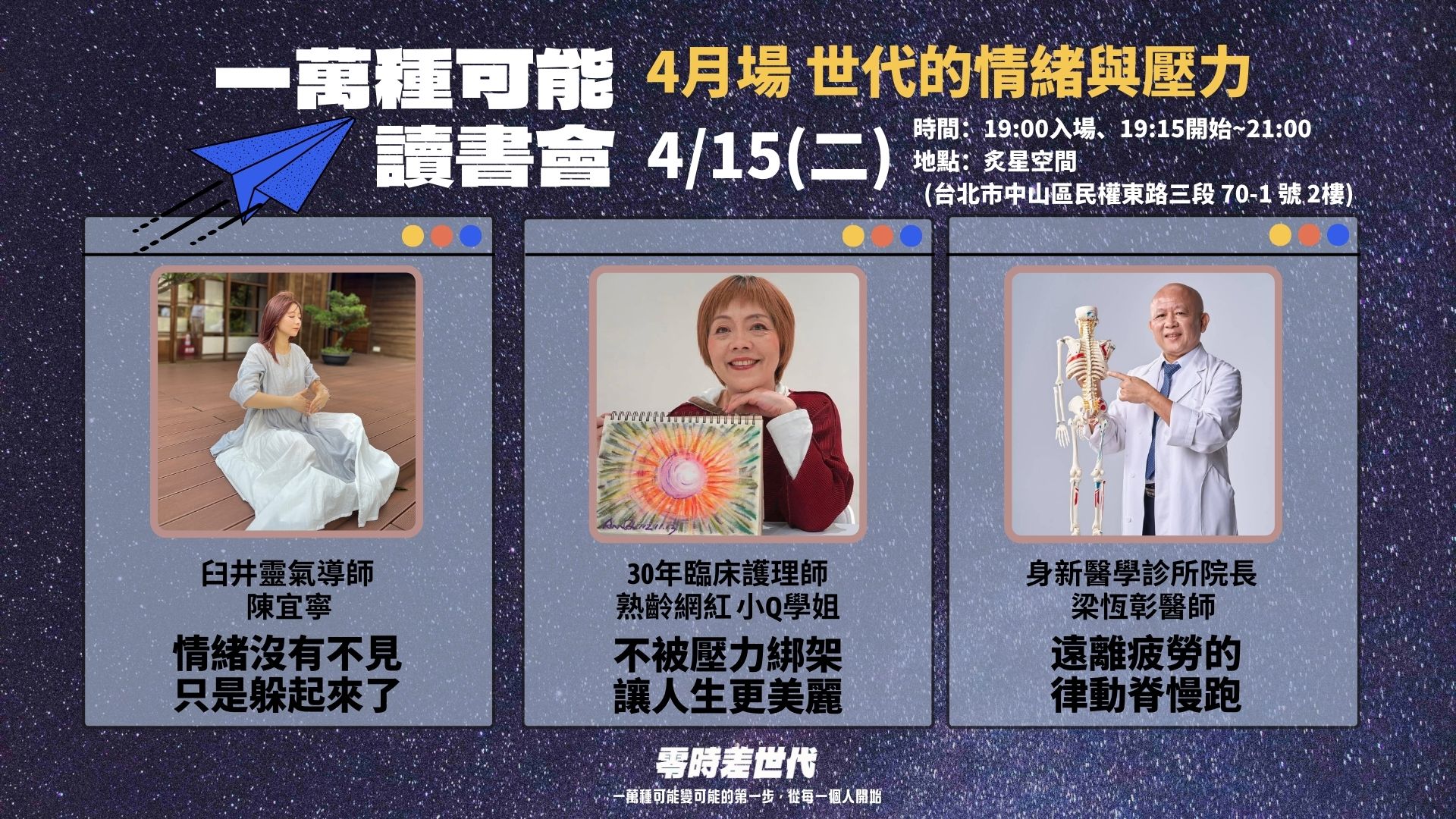 近幾年「情緒議題」越來越被重視,不論是年輕人的生活壓力、銀髮族的退休壓力,每個世代有自己的壓力要面對,看待情緒的方式也有所不同,不同世代的三位講者,將分享他們對情緒的看法、如何接納情緒,以及各自採取的不同方法來緩解壓力。