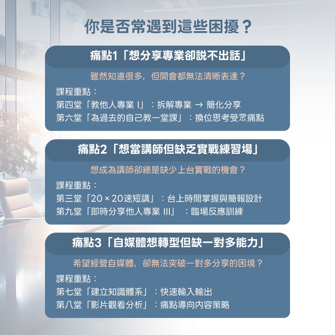 📈10堂課讓你:✅破解「說不出話」的困境→ ✅成為有影響力的講師→ ✅打造個人知識IP