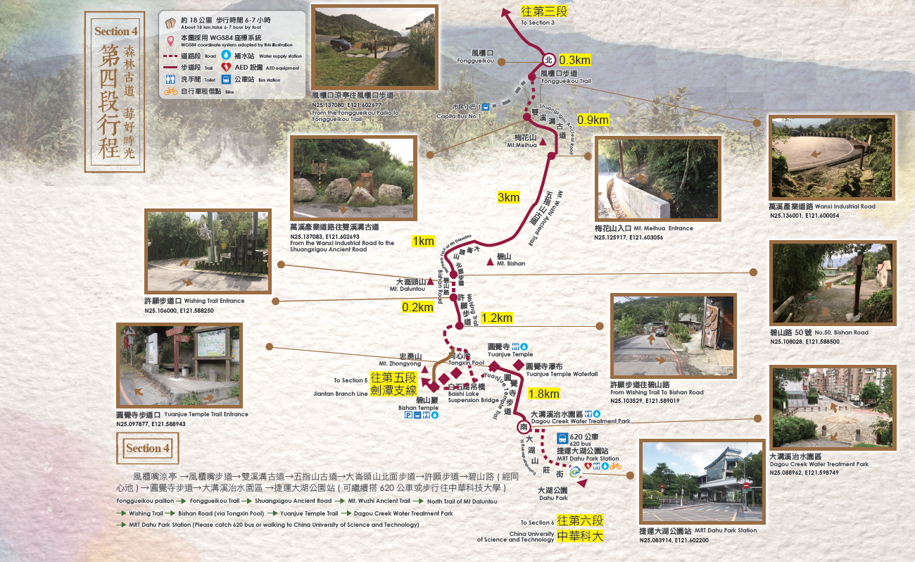 風櫃口→風櫃嘴步道→雙溪溝古道→梅花山→碧山→大崙頭北面步道→許願步道→碧山路(經白石湖同心池)→圓覺寺步道→大溝溪親水公園→捷運大湖公園站