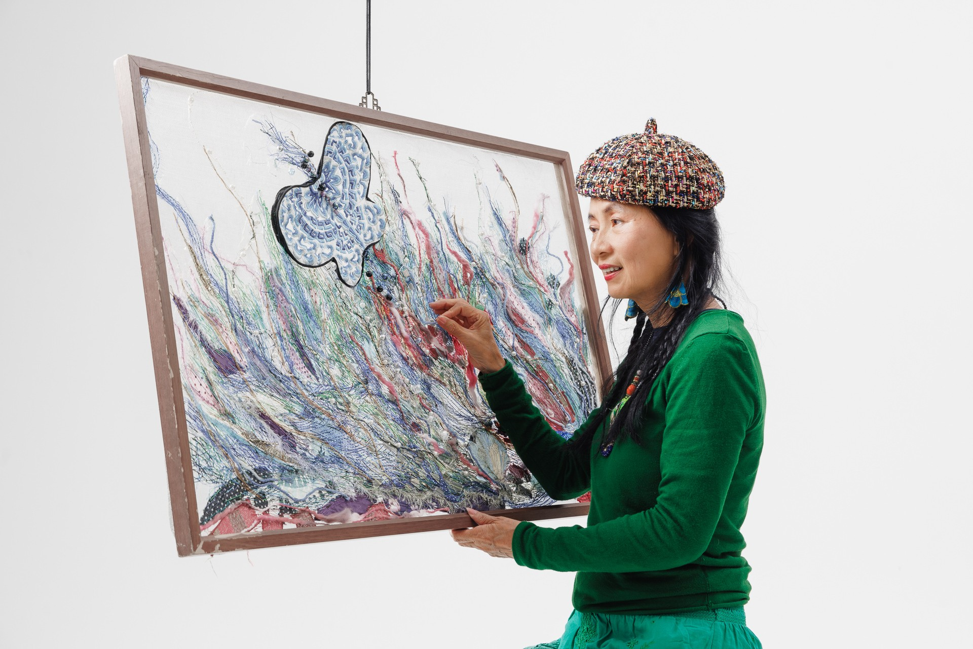 一接觸到刺繡後點燃老師隱藏的藝術魂,不但但舉辦多場展覽,還獲頒總統府的技藝感謝狀,