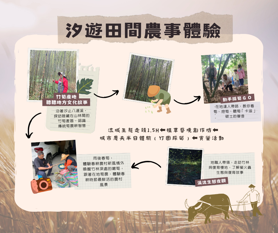 城市里山特色的地碳慢旅行,我們邀請你與地方職人同行,從日間的竹林採筍,到黃昏的山林導覽,一邊親身參與食農與生態體驗,一邊聽見汐止百年來的文化脈絡與農業記憶再到夜晚靜看螢火蟲生態學習與生態環境的和平共融。