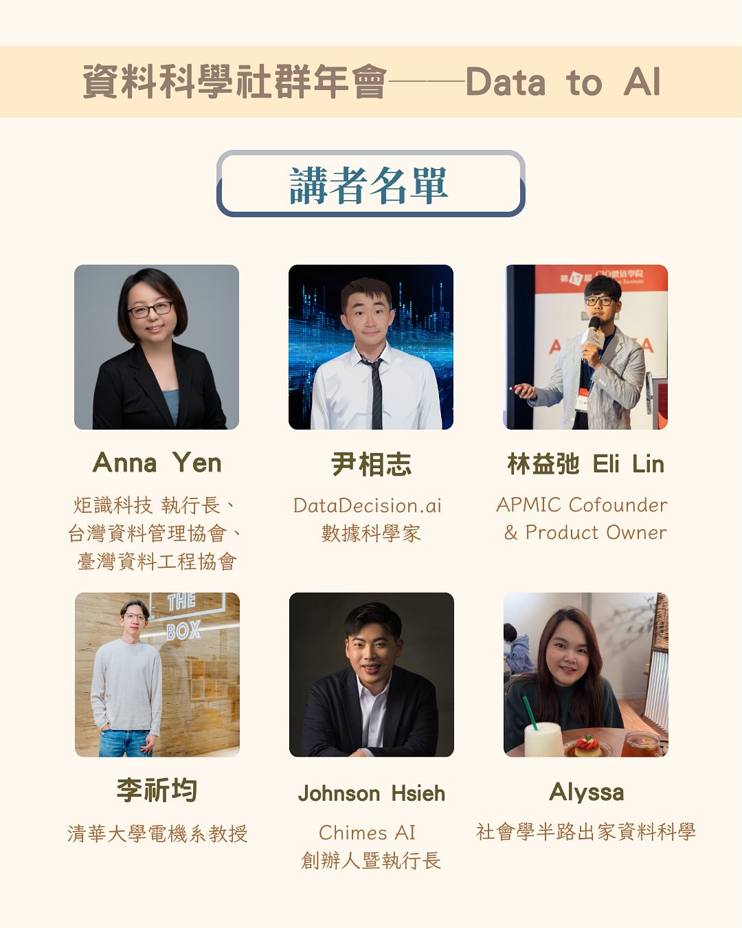 這次活動包含單日議程,共計 6 場的主題演講,邀請來自資料領域的資深業界與學界夥伴