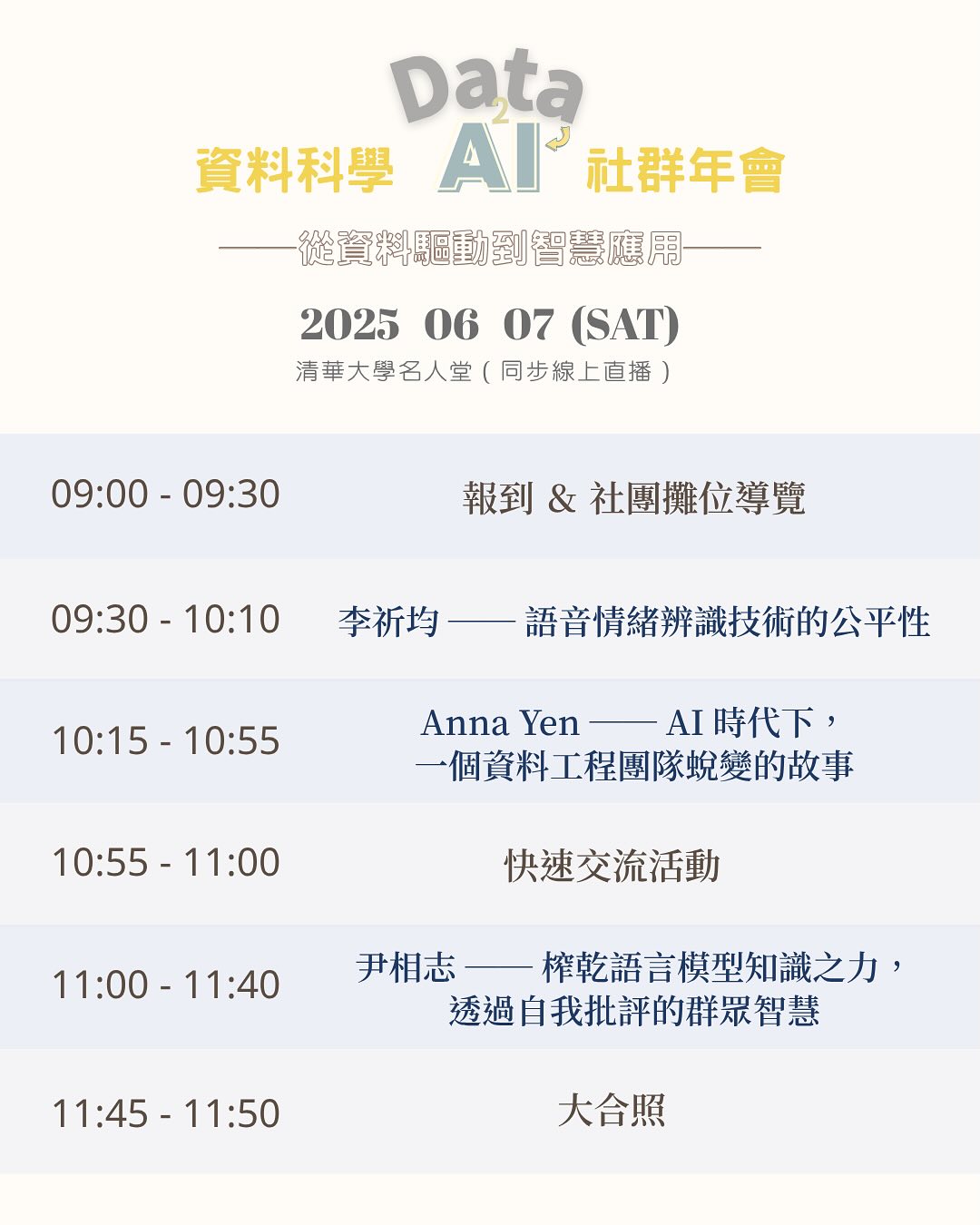 2025 Data2AI 資料科學社群年會 由來自全台各地的資料科學技術社群與學生社團共同發起,致力於打造一場串聯學術界、產業界與學生社群的年度盛會。以「 Data to AI:從資料驅動到智慧應用 」為主軸,我們期望透過技術社群的串連,凝聚全台資料科學愛好者,打造跨學校、跨產業、跨領域的深度交流平台,推動知識共創、合作學習與人才連結,讓更多人能在這波 AI 革命中找到自己的位置與價值。