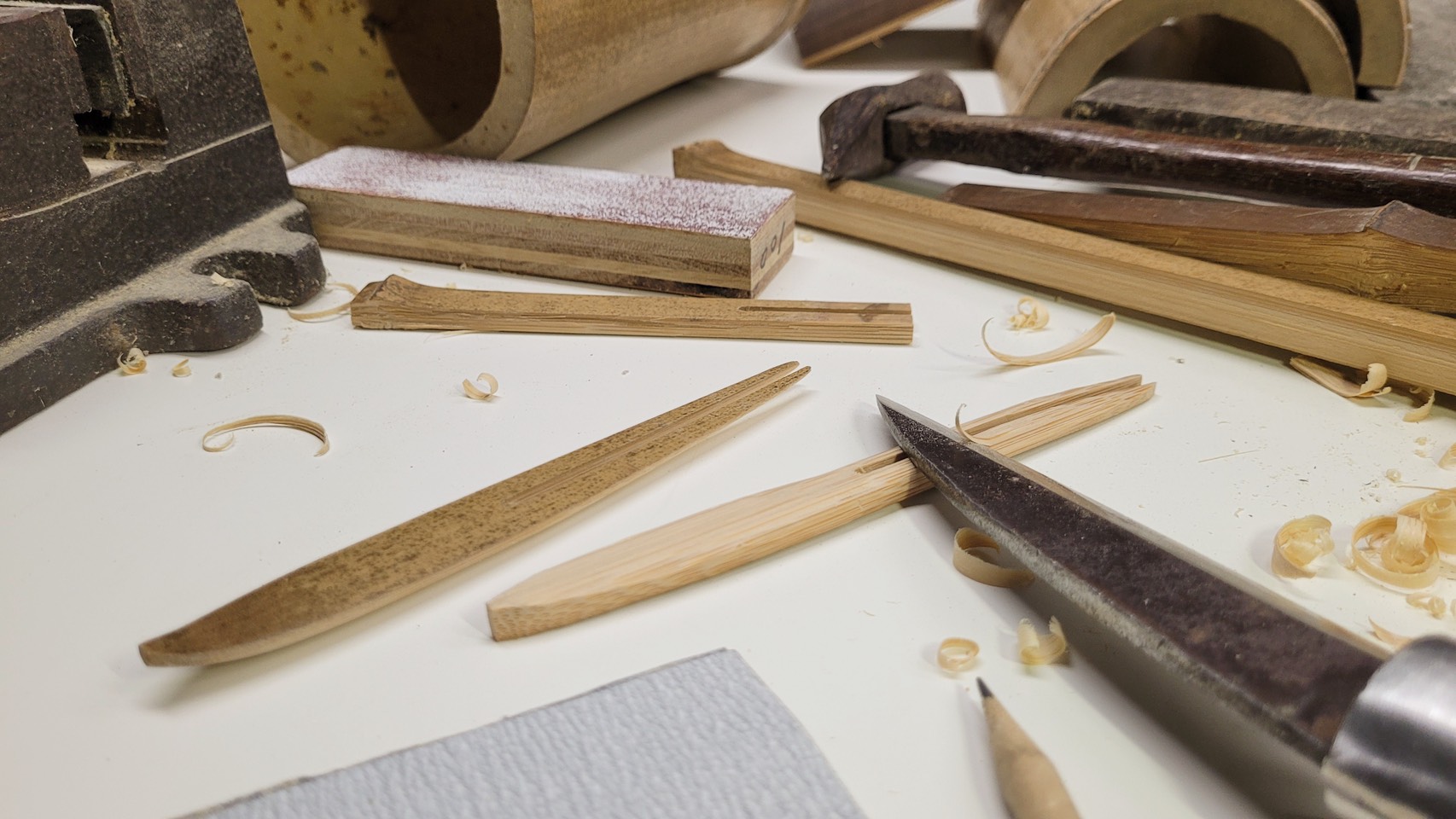 從原始竹管出發,透過簡易手工具進行劈剖、鋸切、鑽孔、手削、研磨、刮青與塗裝等步驟,帶領民眾認識竹材處理的基礎工藝,親手感受竹纖維的溫潤質感。