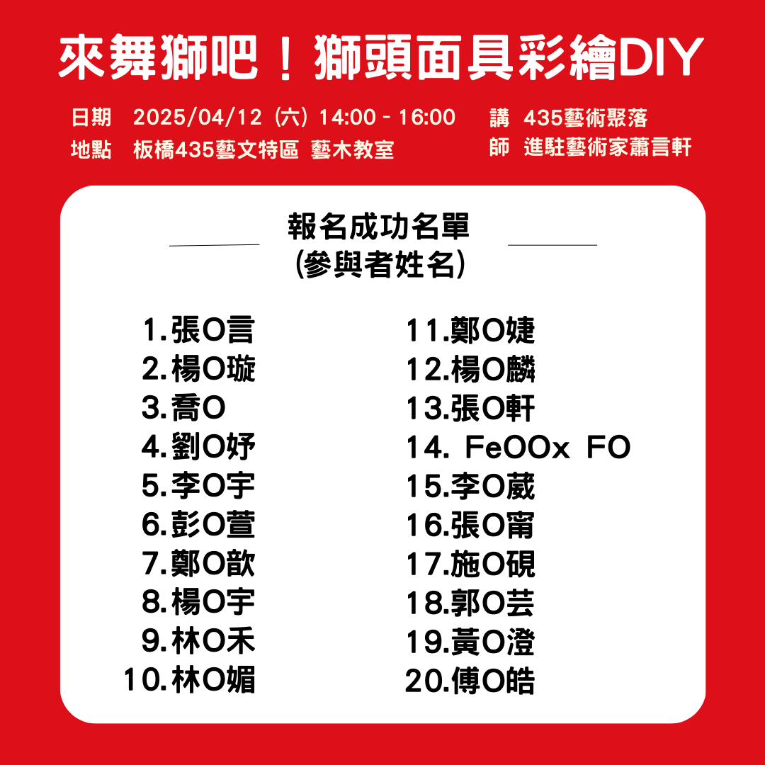 o 報名成功名單將於活動前公告於活動頁面及板橋 435 藝文特區 Facebook 粉專相關貼文留言處。