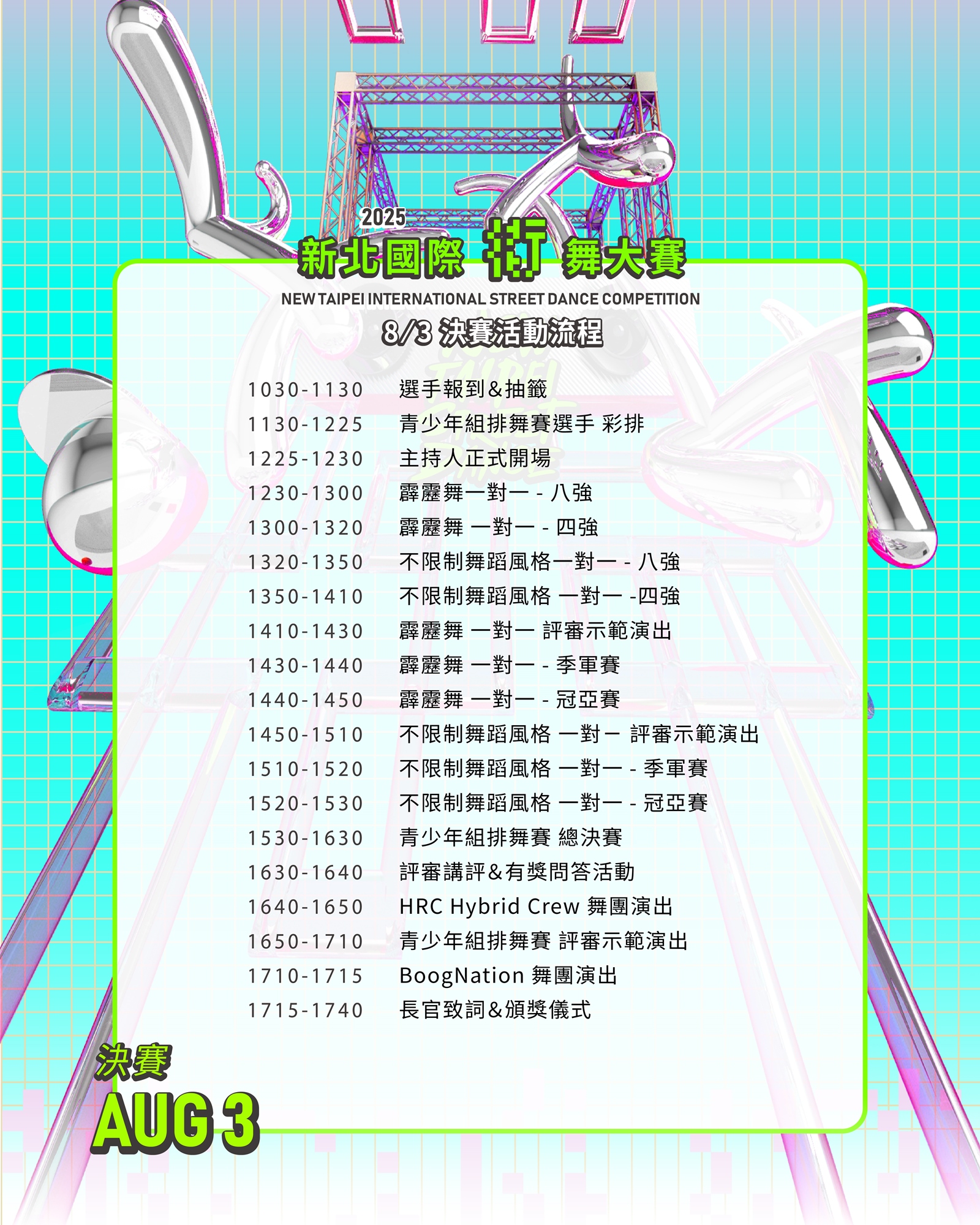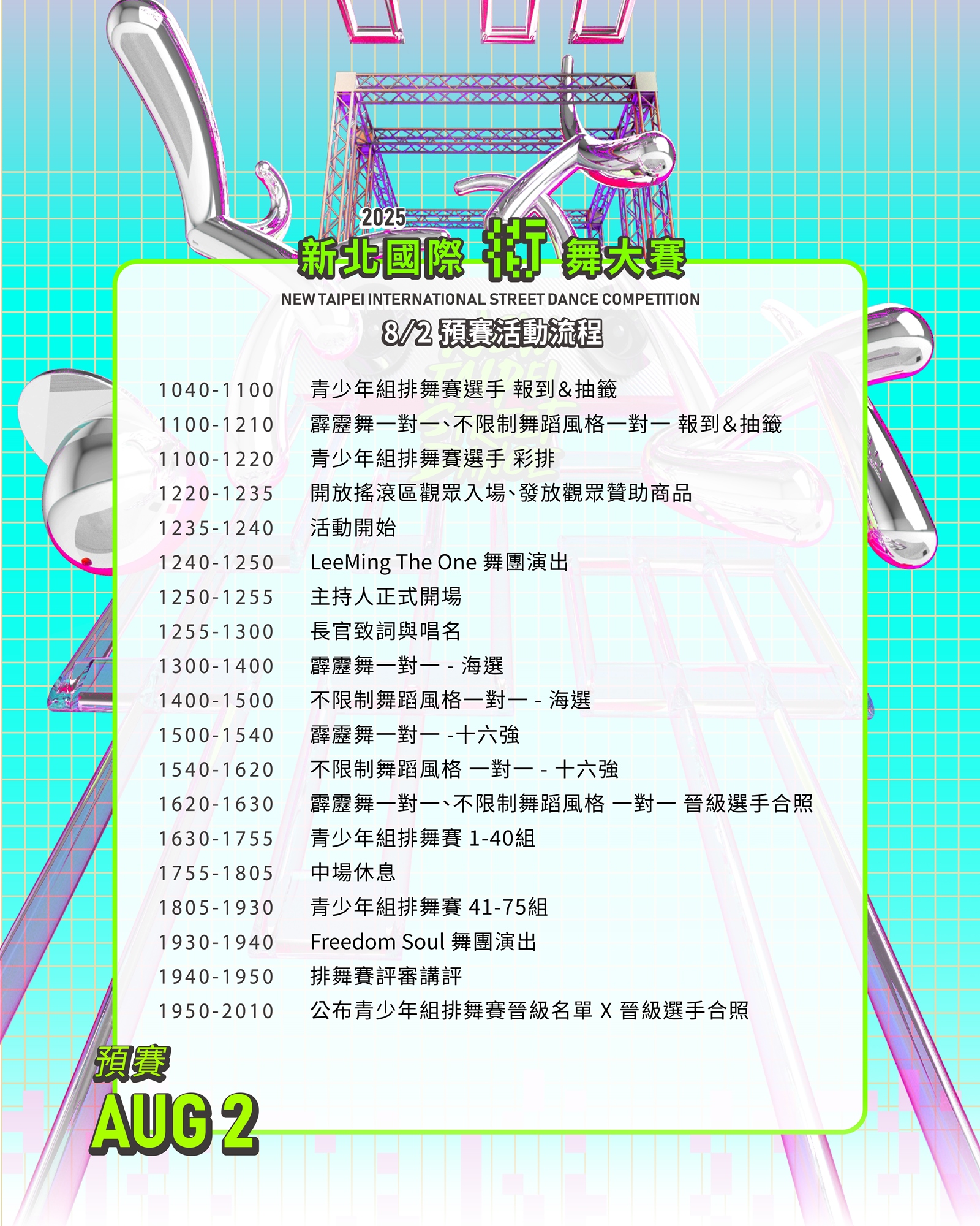 另外亦規劃,最大宗參賽人口項目:All Style 1 on 1(不分舞蹈風格一對一)及本賽事最經典項目:排舞賽-青少年組(限高中/職含以下學歷),讓所有喜愛街舞族群都可以有展露頭角的機會。