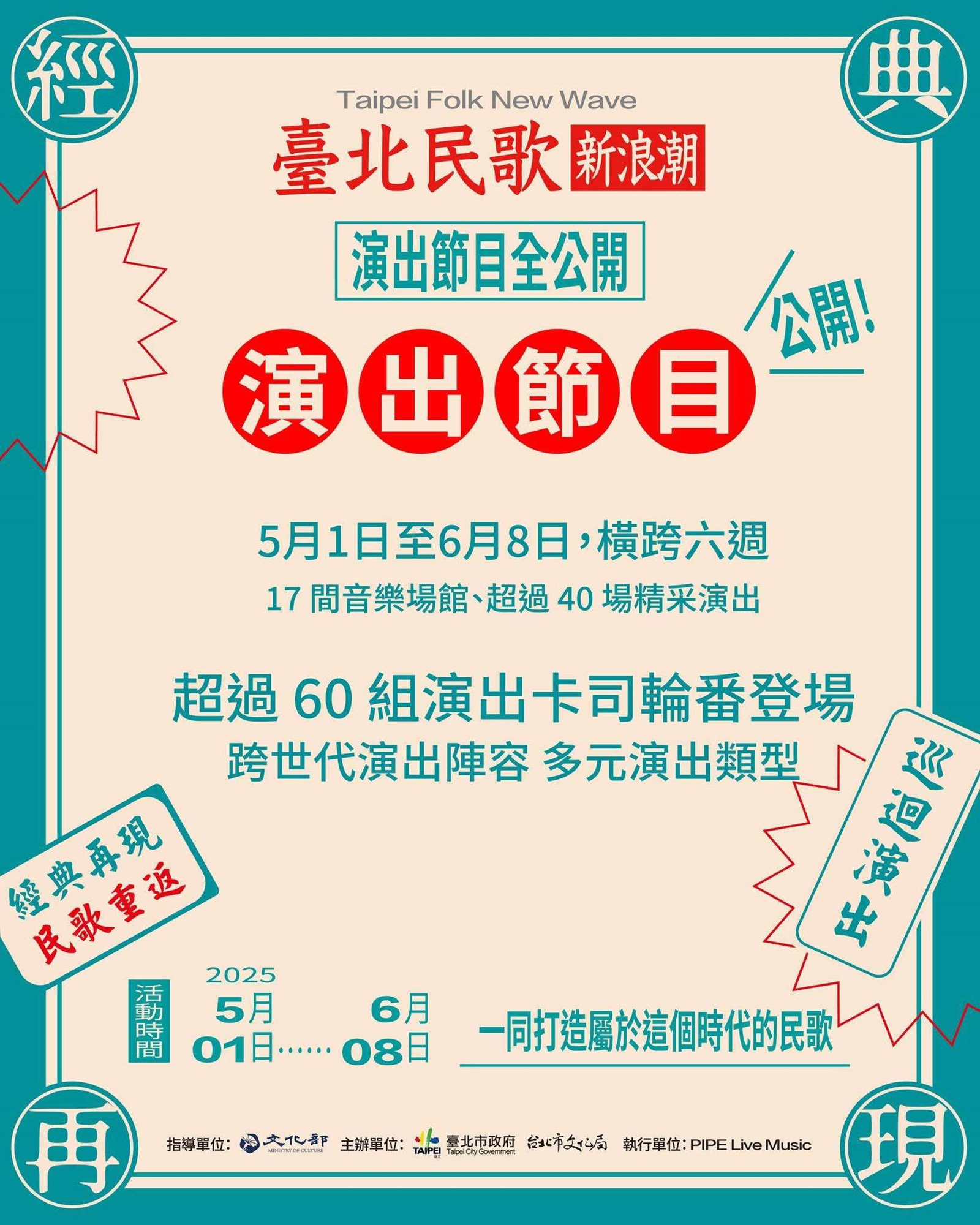 臺北市擁有全國最多的音樂展演空間,具有豐富的流行音樂發展歷史,適逢民歌誕生50周年,臺北市政府串聯 Live House、音樂酒吧、音樂餐廳等具音樂現場演出專業的空間業者,共同發起「臺北民歌新浪潮」活動,共17家業者聯合響應,活動期間從5月1日至6月8日,橫跨6週,將舉辦超過40場演出、60組跨世代藝人的多元音樂演出,讓民歌在城市各角落以嶄新樣貌延續與發聲,打造獨具臺北城市特色的音樂風景。