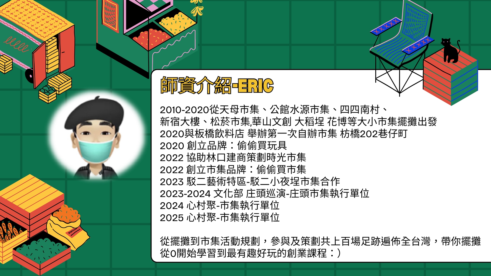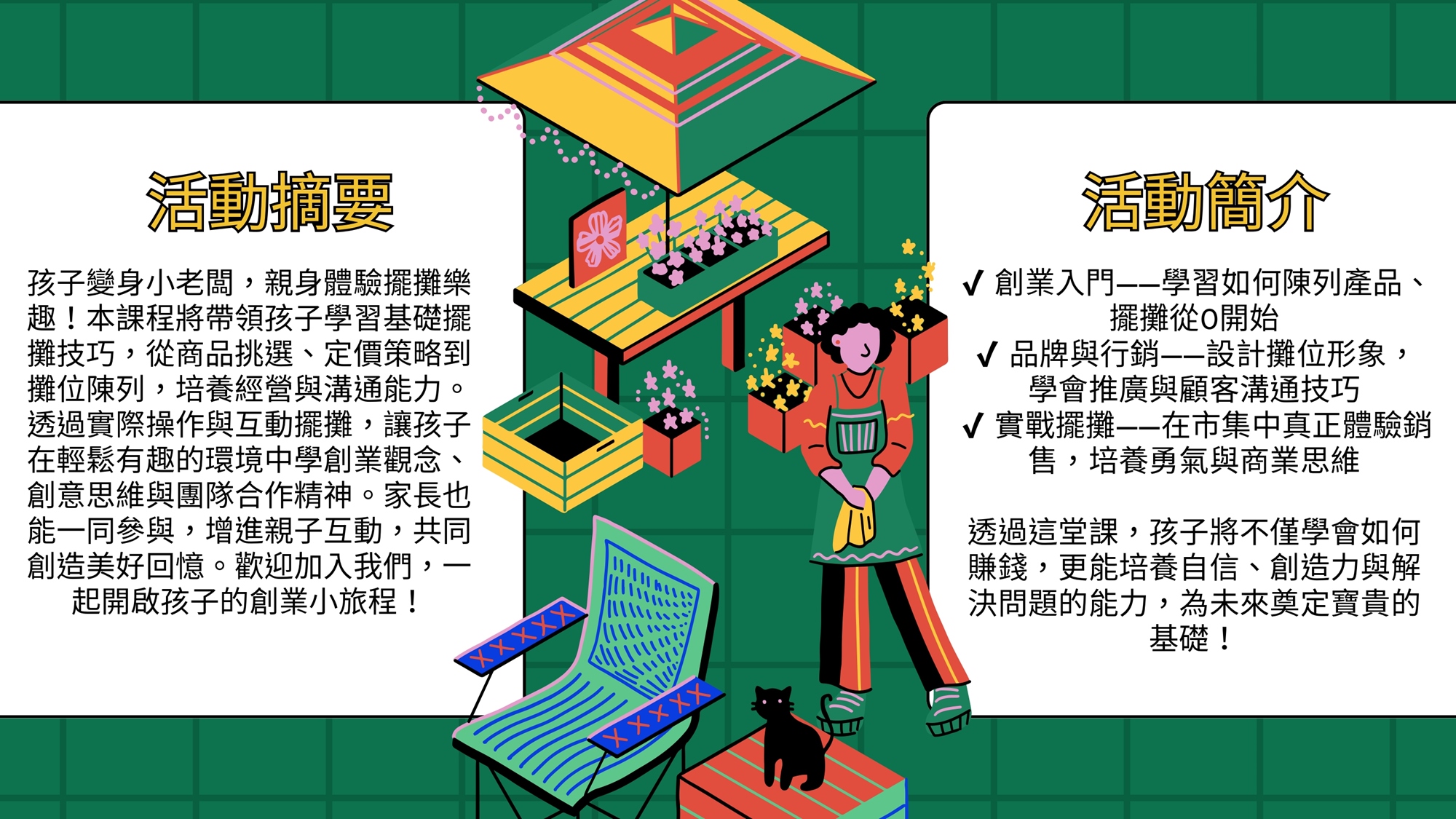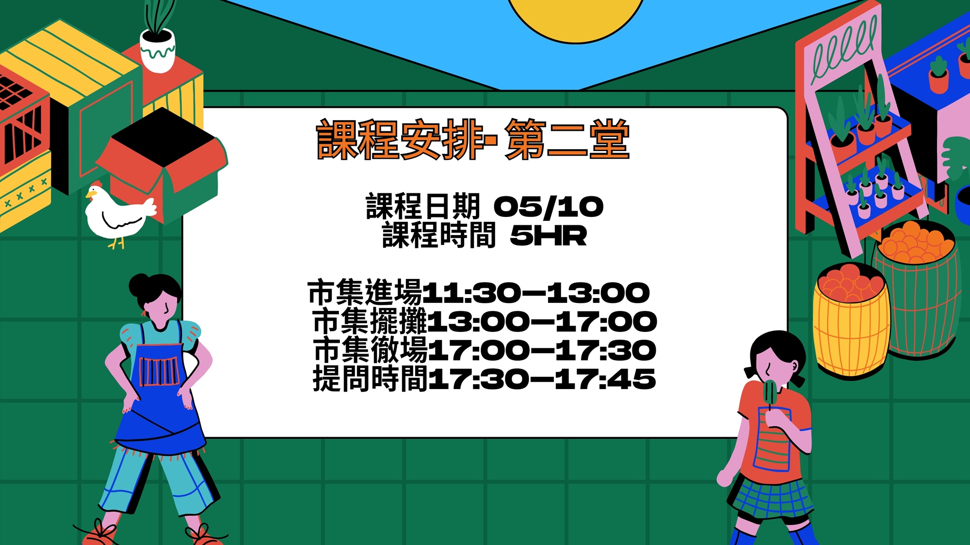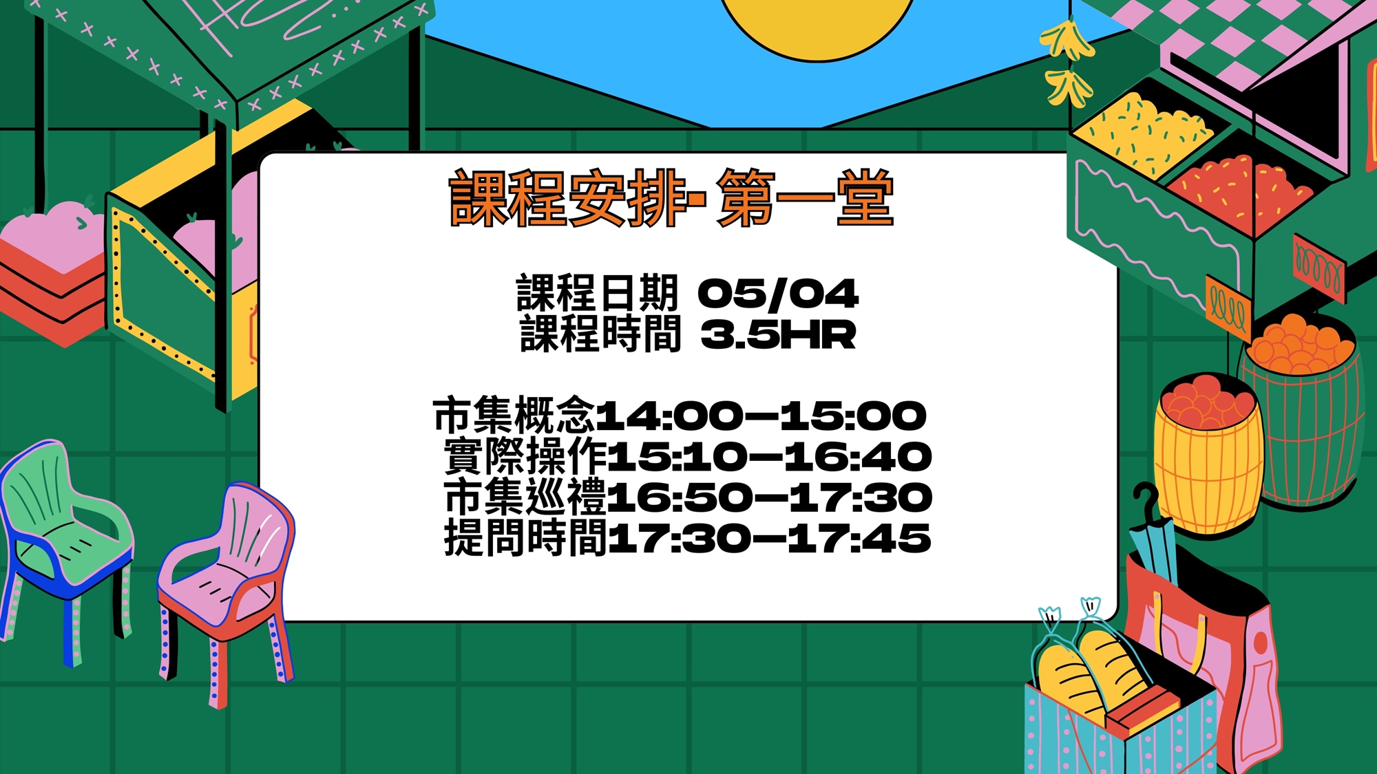 活動時間:5/4(日)14:00-17:45(基礎課程教學)、5/10(六)11:30-17:45(市集擺攤實際操作)。
