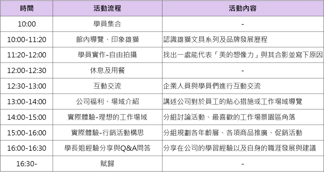 本次體驗將由雄獅文具帶領學員們認識各系列產品、觀光工廠場域到品牌發展歷程,並讓學員們發覺美感與創意體驗、漸層彩色筆製作與演練規劃商品行銷活動,從產品製作到行銷的一條龍體驗,打造完整且成就探索創意、孕育美感的「想像力製造所」職場體驗。
