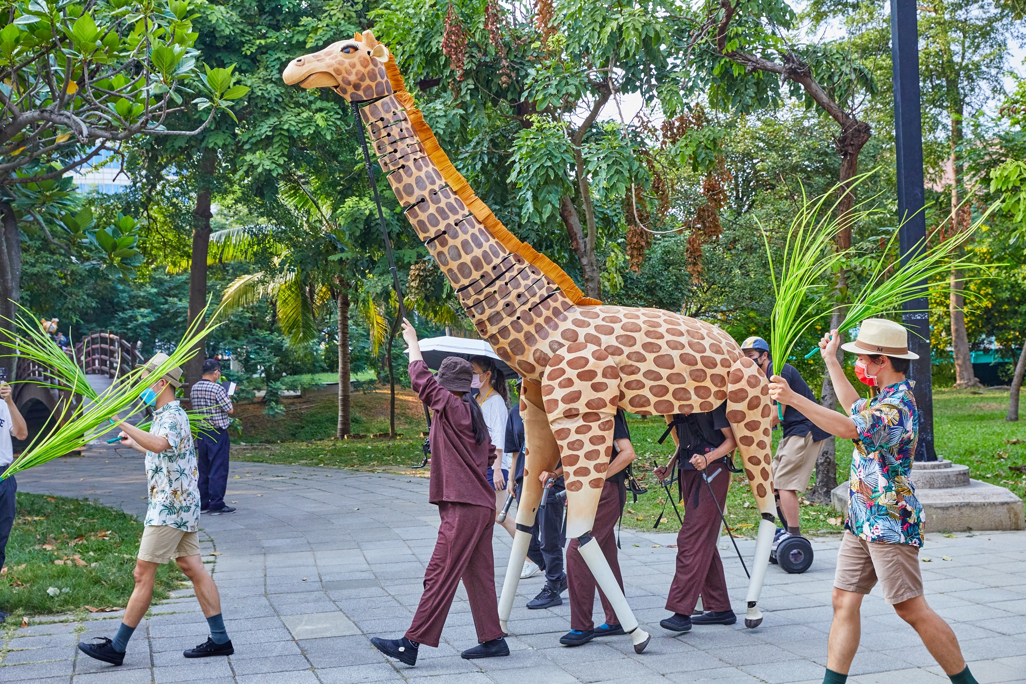 在阿甯咕的帶領下,來自無獨有偶工作室劇團的奇幻大偶「長頸鹿」優雅登場,彷彿將街道幻化為非洲草原,緩緩穿梭在人群之間。牠是旅途中最溫柔的旅伴,邀請孩子們一起餵草、拍照、交換微笑,讓想像力成為最好的交通工具。