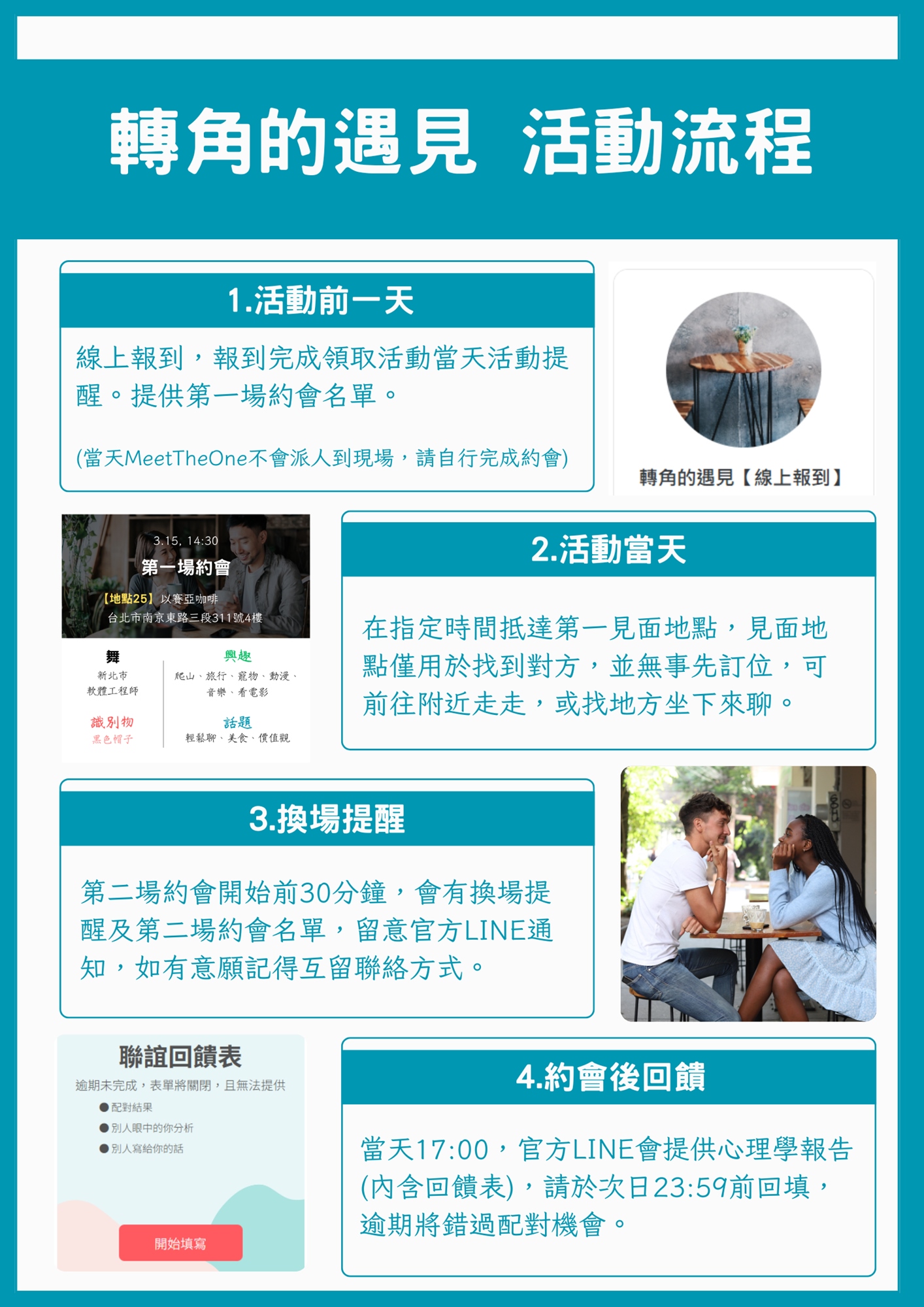 - 每場次會有兩位媒合對象的約會,但不排除因各種因素可能無法到場,如活動中有一位對象無法到場,我們將退還35%金額。
