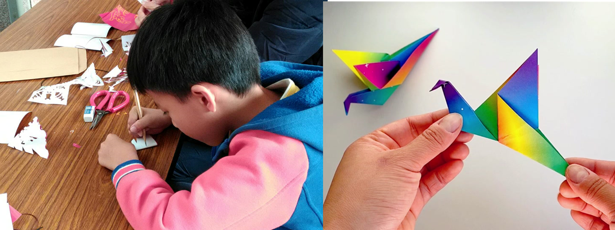 在老師的教導下,一起來體驗客家的傳統紙技藝,一起來研究客家剪紙,跟著老師了解不同形狀所代表的含意,並嘗試著將造型剪出來拼組,也一起動手摺紙,一起摺出會動的平安鳥,會跳的小青蛙,體驗摺紙的樂趣。