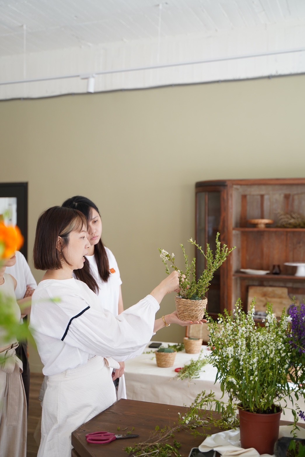 以海綿為基底,用藤籃裝入只屬於此時獨有的花草,