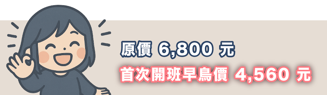6,800 NT$早鳥價:4,560元(67折) - 名額限制:台北班限額 20 人,小班實作,確保每位學員產出完整作品