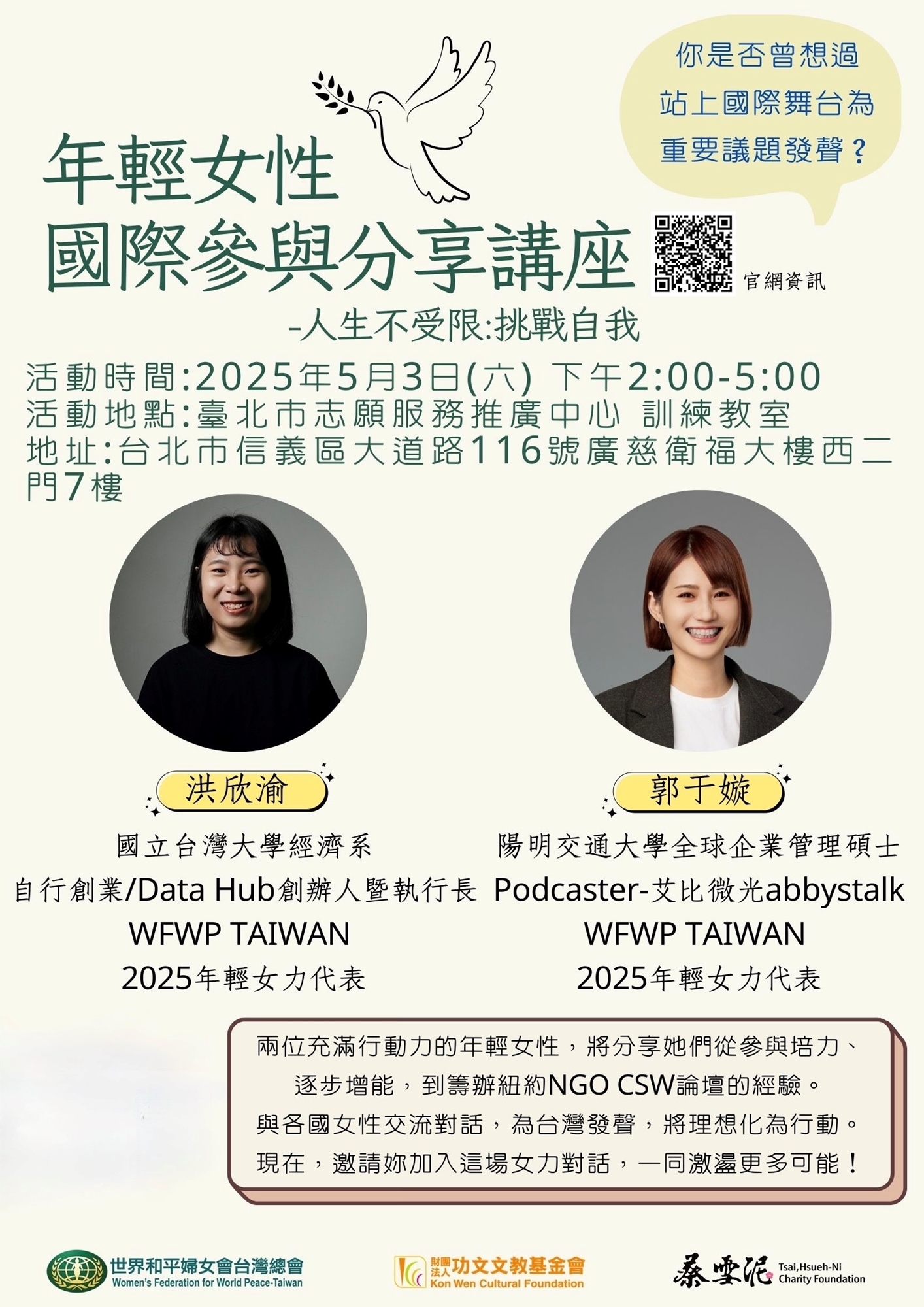 現在,我們誠摯邀請你,一起加入這場屬於女力的國際對話,激盪更多可能,為未來發聲!
