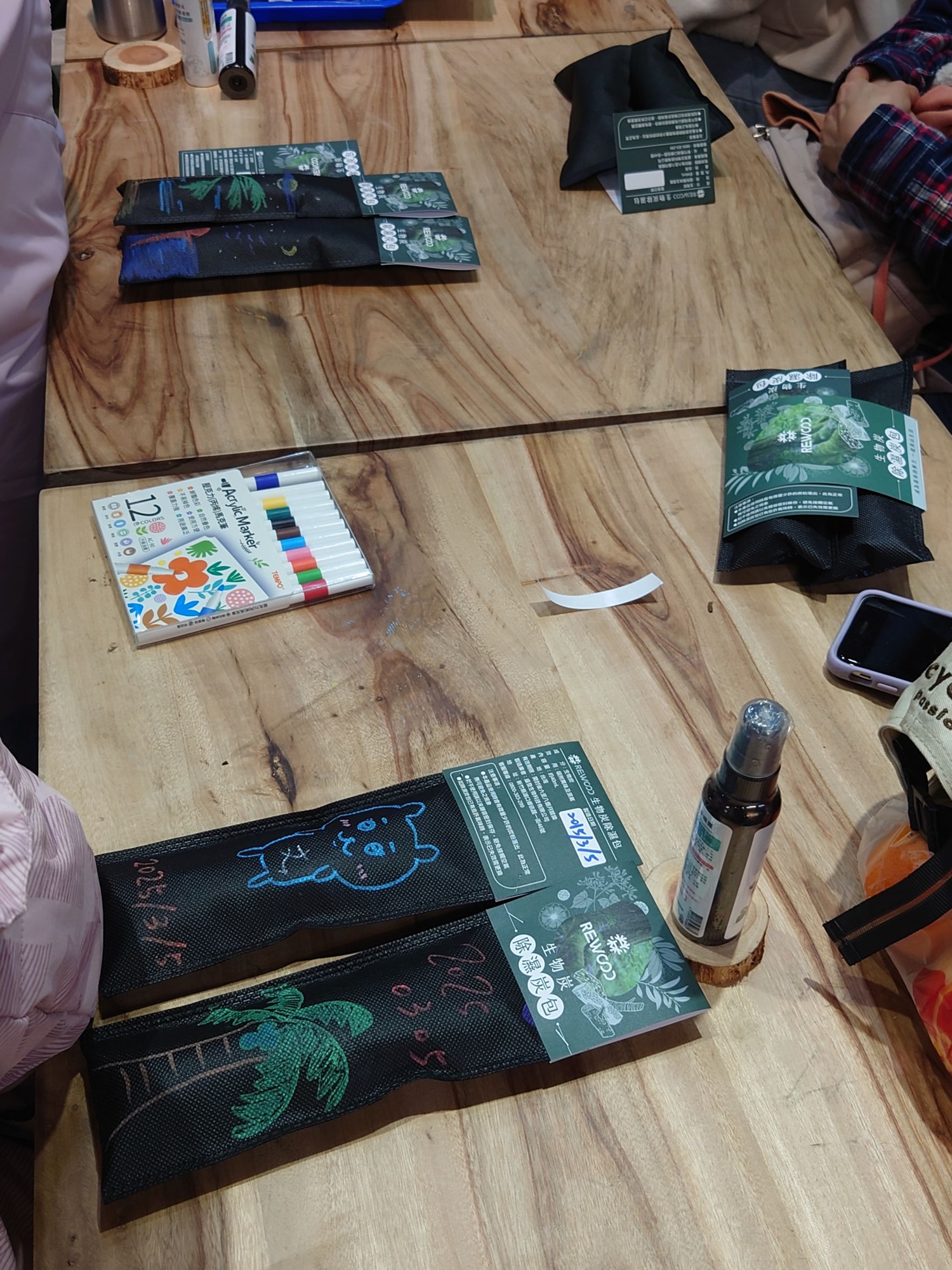 ●活動說明:利用碳多孔質地可吸濕、吸附臭源並淨化空氣, 將回收木資材高溫碳化後製成的環保除濕炭,搭配透氣不織布,完成兼具美感與功能的小物,最後用畫筆彩繪DIY專屬獨一無二的作品