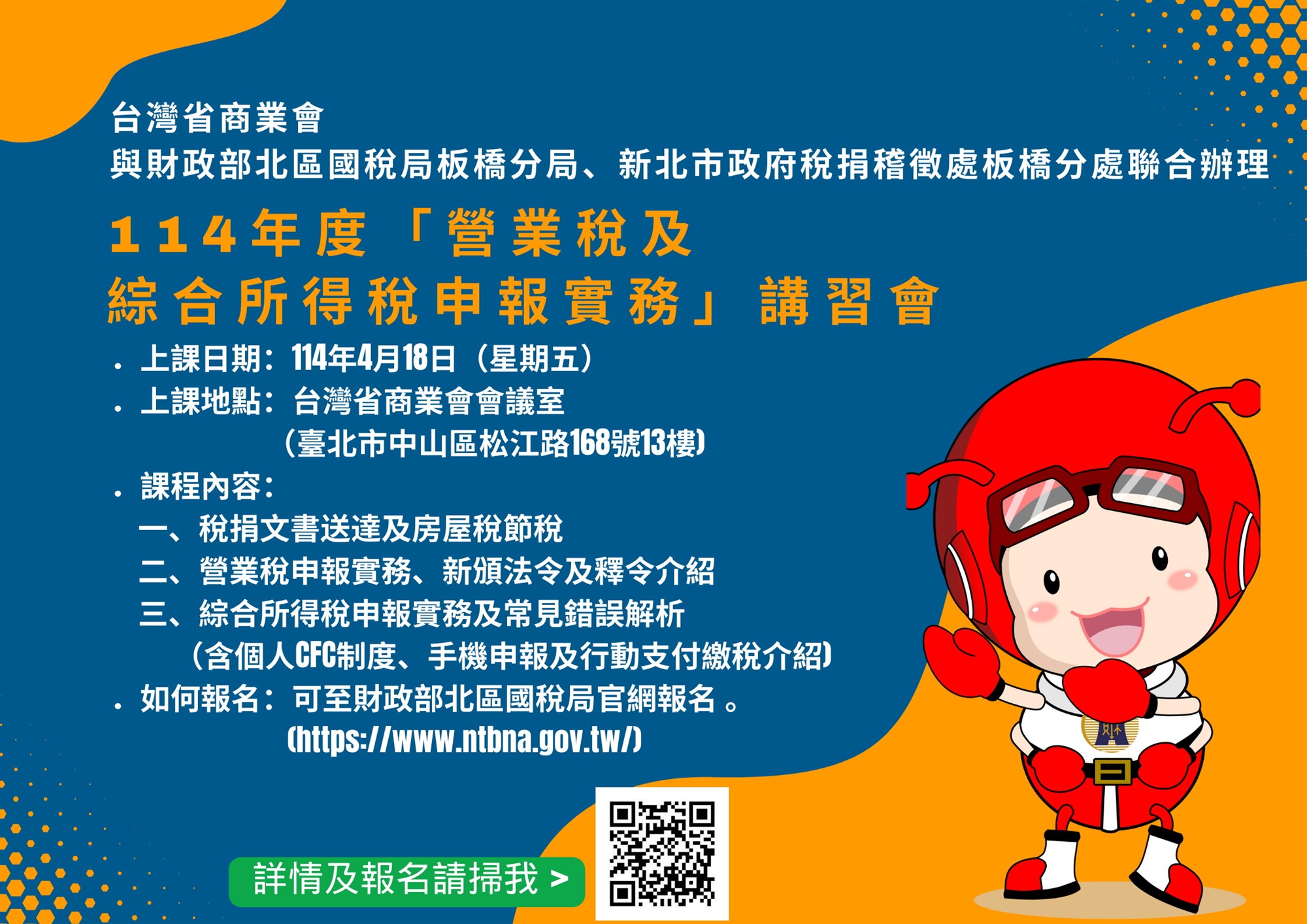 報稅季節即將到來,為協助納稅義務人熟悉申報流程及稅務相關規定,台灣省商業會特別與北區國稅局板橋分局攜手合作,舉辦營業稅及營利事業所得稅申報實務宣導活動,透過專業說明與案例解析,加強民眾對正確申報的認識,協助大家依限完成申報,避免因誤報或漏報而產生罰則。本次活動亦將重點介紹最新稅法修正內容,並針對常見申報錯誤進行說明,降低違章案件發生率,提升稅務遵從度。另為擴大服務效能,也特別與新北市稅捐稽徵處板橋分處合作,進行跨機關法令解析,涵蓋地方稅相關規定,讓民眾一次掌握中央與地方稅務重點。期盼透過本次多元宣導與協作交流,不僅提升公務機關整體行政效率,更能強化便民服務品質,真正落實為民服務的核心理念。