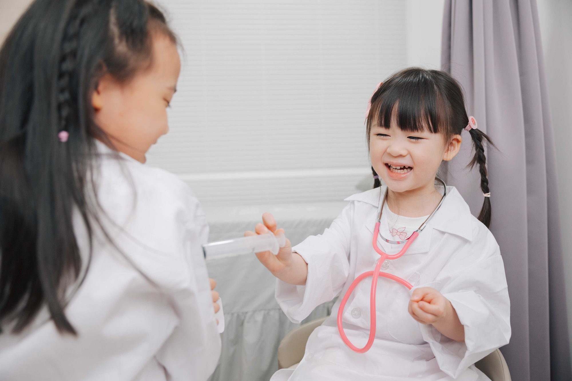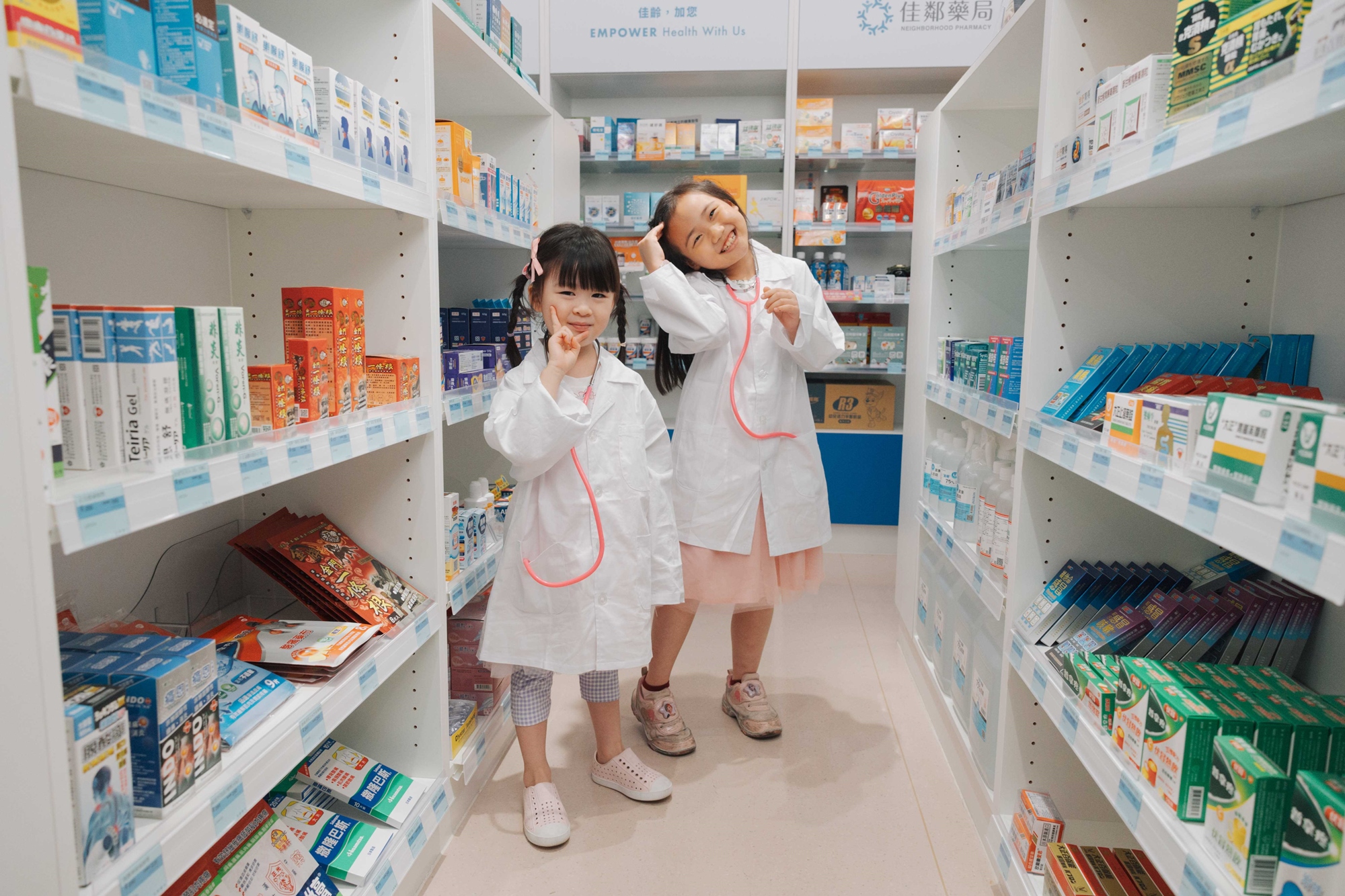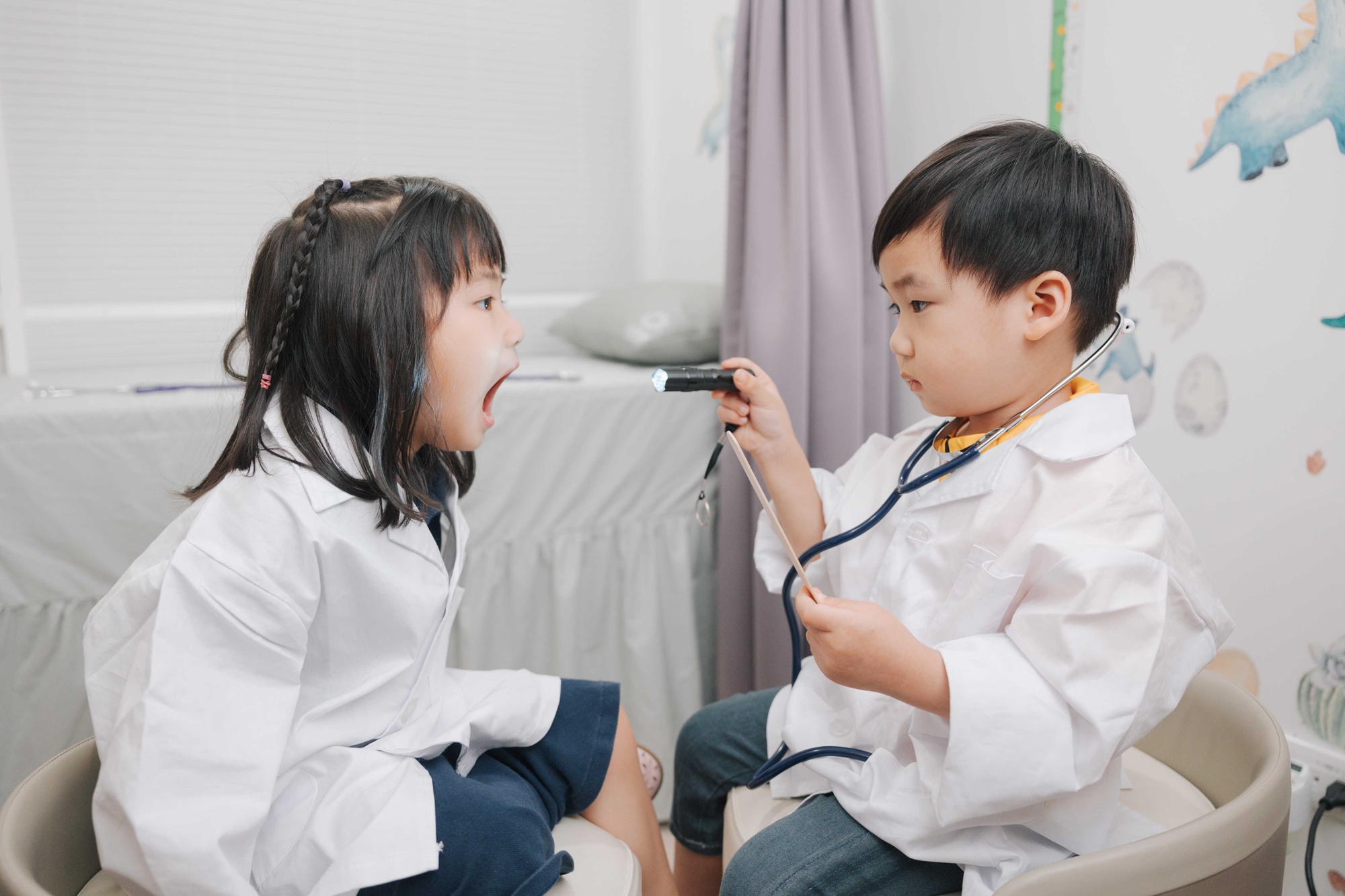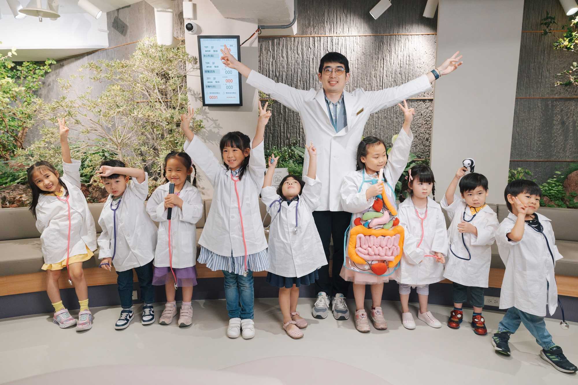 讓小朋友穿上醫師袍,戴上聽診器,了解身體各器官,從問診、聽診、到開藥流程完整了解
