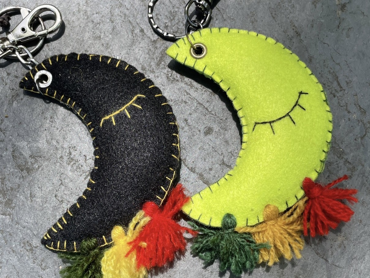 神山部落為月神也喜歡居住的部落,因此神話傳說,部落將月亮作為意象,推出一系列部落產品。月亮吊飾為神山部落最夯紀念品,可作為掛飾或鑰匙圈所用,月亮下方的黃綠紅三色線,為魯凱族代表色系。製作吊飾過程中,能夠邊聽著這個故事,讓手中的月神也更有感情。