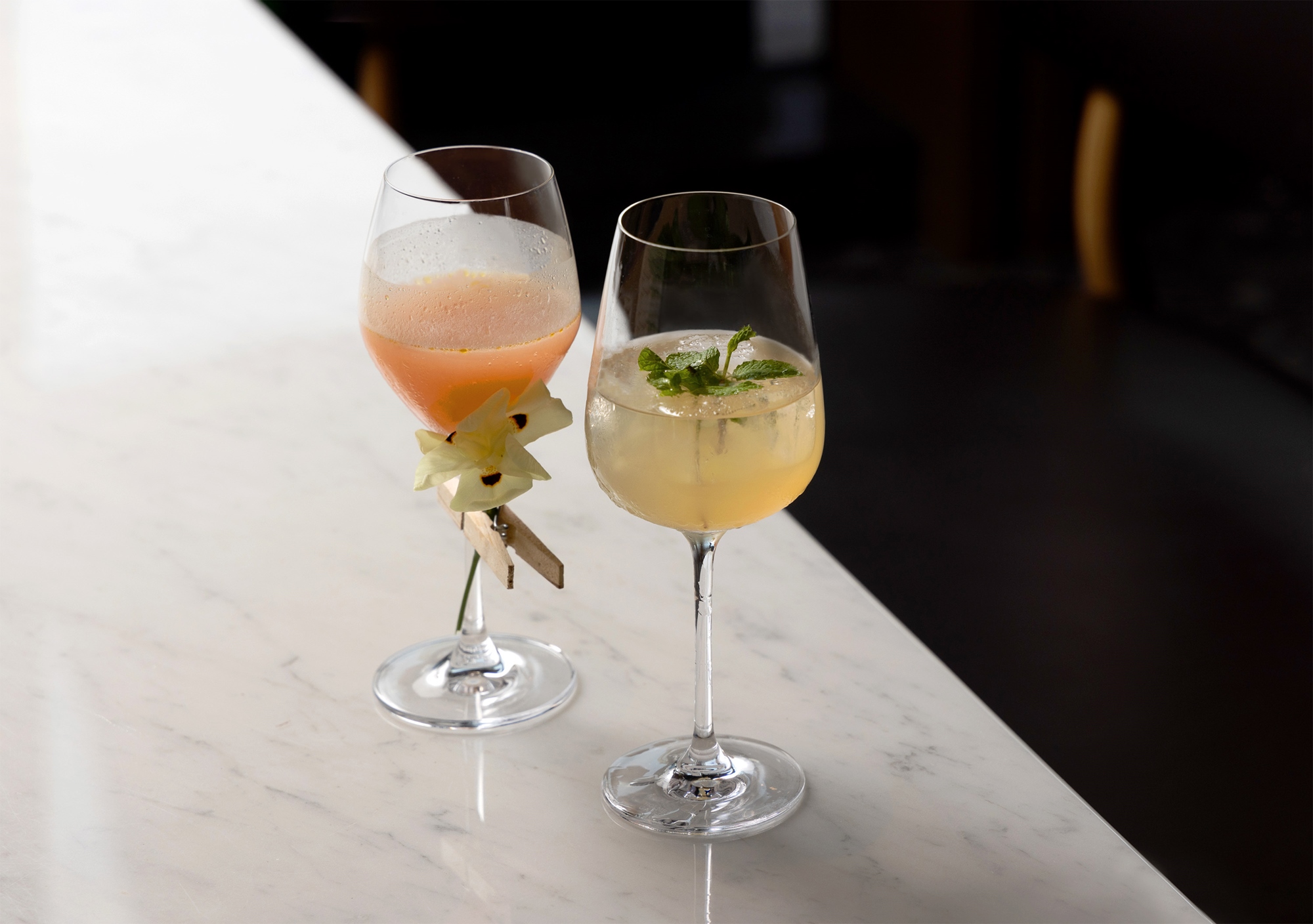 Bellini Bloom 綻放 : 靈感來自威尼斯經典雞尾酒 Bellini,以白桃果泥為基調,融合檸檬、桂花與淡雅梅香,使用「Bloom 無酒精氣泡香檳調飲」取代 Prosecco,帶出春日花果氣息。