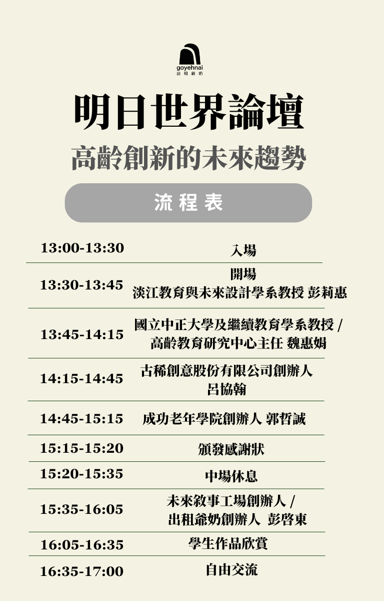■ 這場高齡創新未來趨勢論壇,邀請到四位來自不同領域的專家學者,深入分享關於高齡教育、趨勢、創新、代間共創等經驗與洞察,從多元視角裡分享高齡議題的廣度與深度。同時,也邀請來自大專院校的學生團隊,提出對高齡創新的創意提案,並實地執行後進行學生作品分享。