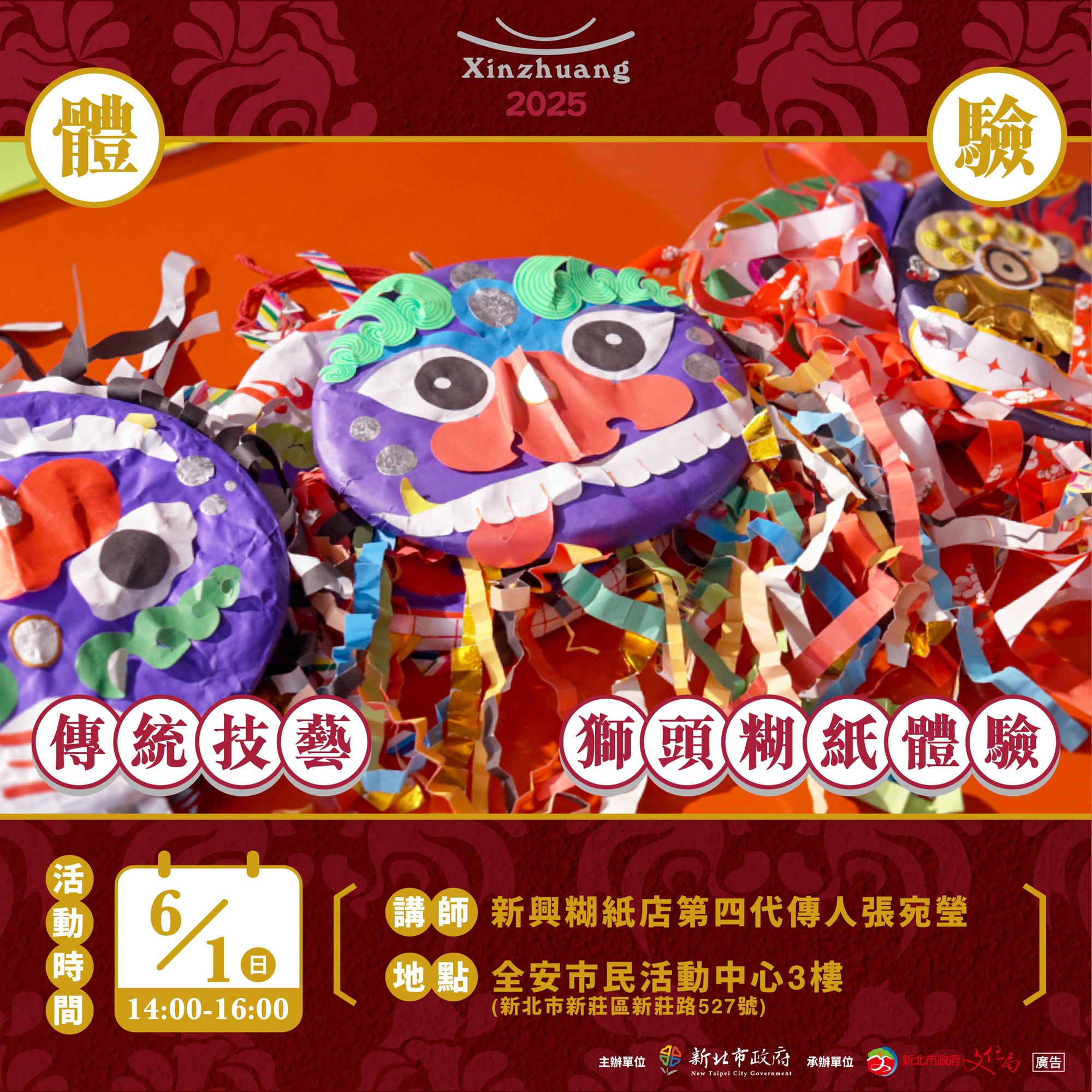 邀請新莊在地新興糊紙店第四代傳人張宛瑩教授獅頭面具 DIY 製作,讓參與者親手製作並了解糊紙文化的歷史與工藝技巧,期望在課程中盡情發揮自己的創意,做出許多有趣的作品。