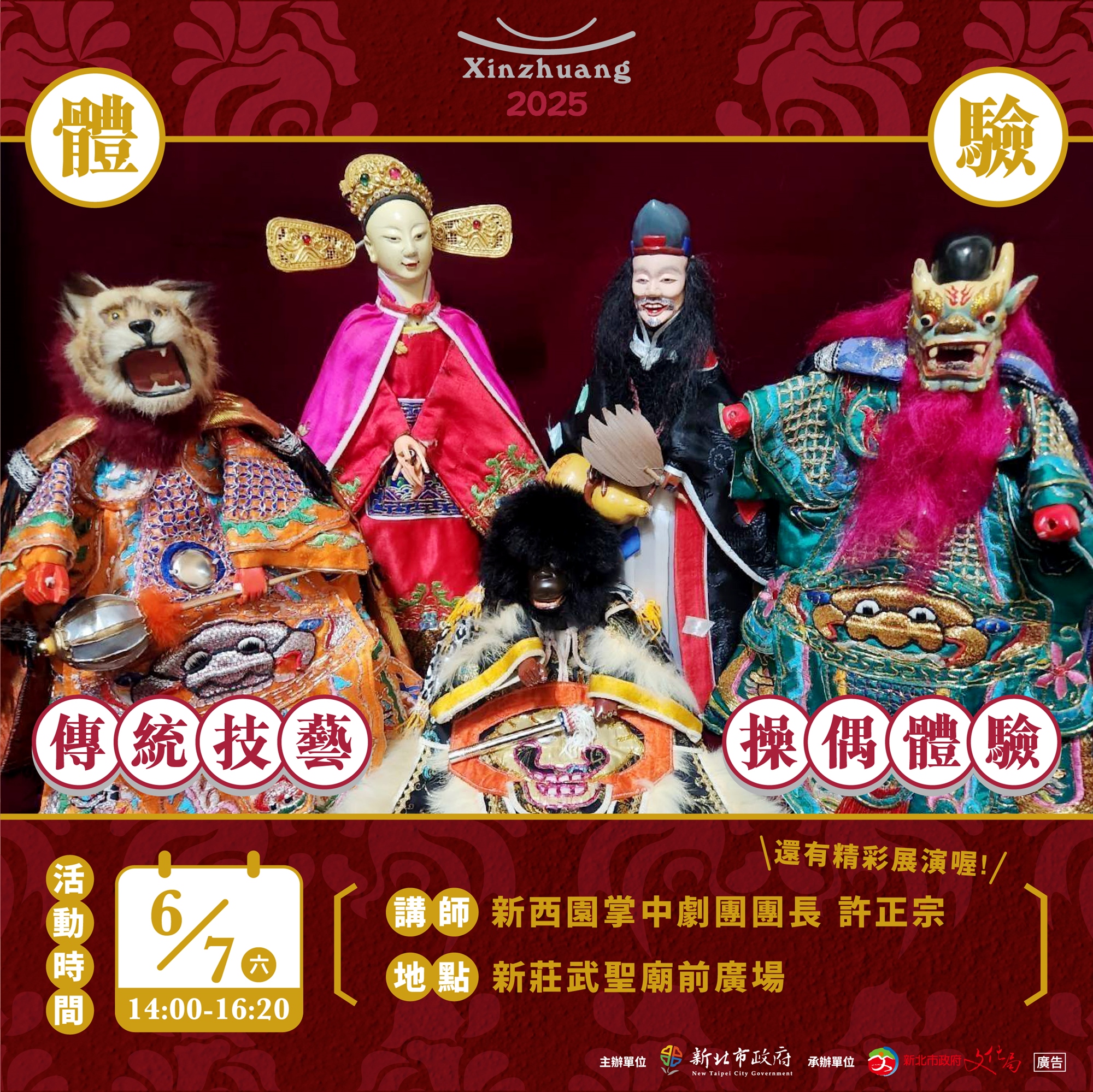 本活動邀請新西園掌中劇團—許正宗團長介紹掌中劇的由來與歷史背景並現場教授「掌中劇操偶」,參與者將近距離接觸精緻戲偶,學習基本操偶技巧,感受手眼並用、活靈活現的演出方式。最後,學員們將欣賞新西園的《濟公傳奇 收妖救狀元》精采表演,進一步深化對傳統布袋戲藝術的認識與印象。