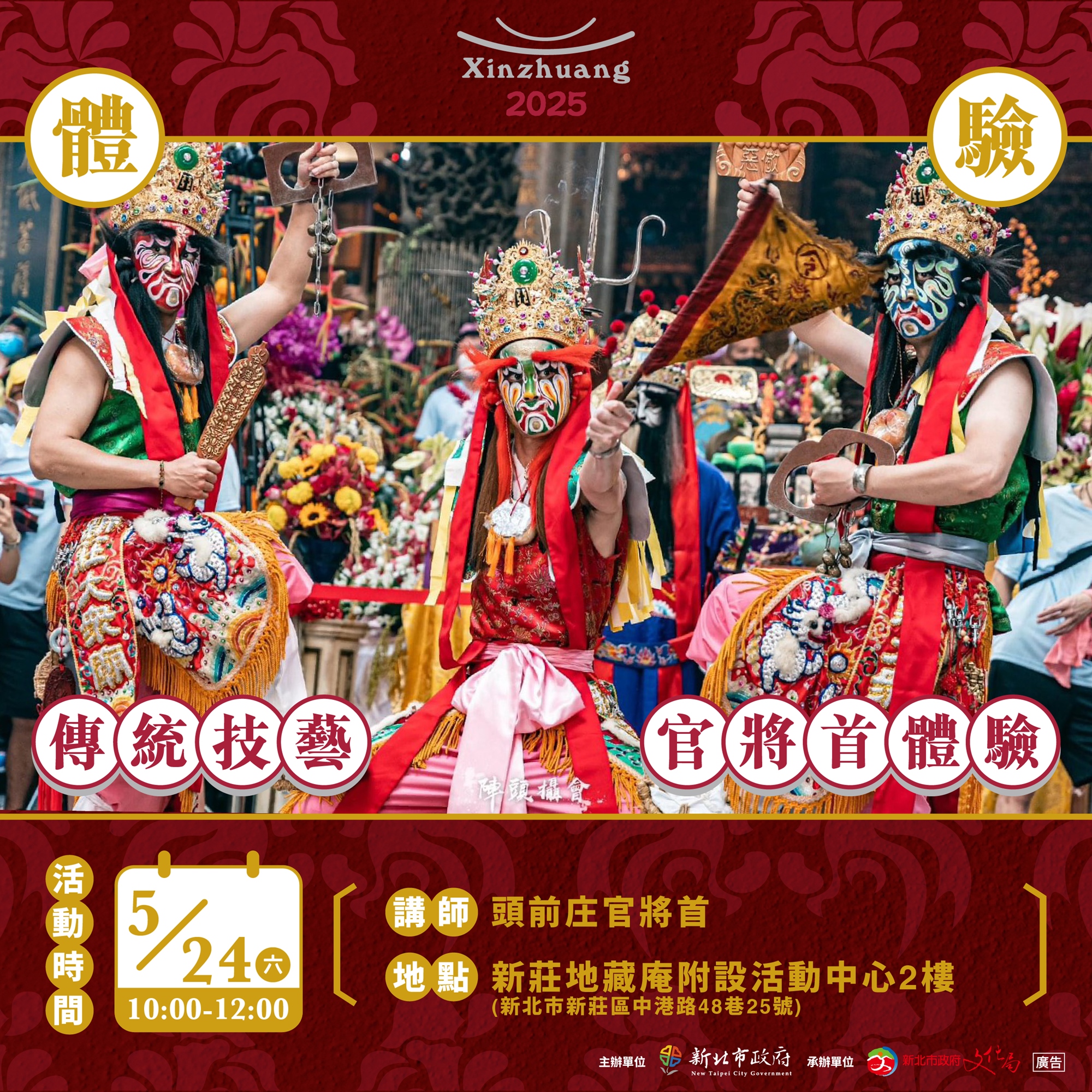 本活動邀請新莊地藏庵頭前庄官將首團隊介紹官將首文化與故事,並提供「三步贊」和「吹海螺」的教學體驗,參與學員將有機會穿上官將首部分服飾。透過互動式學習,拉近學員與傳統陣頭的距離,讓這項珍貴的民俗技藝得以傳承發揚。