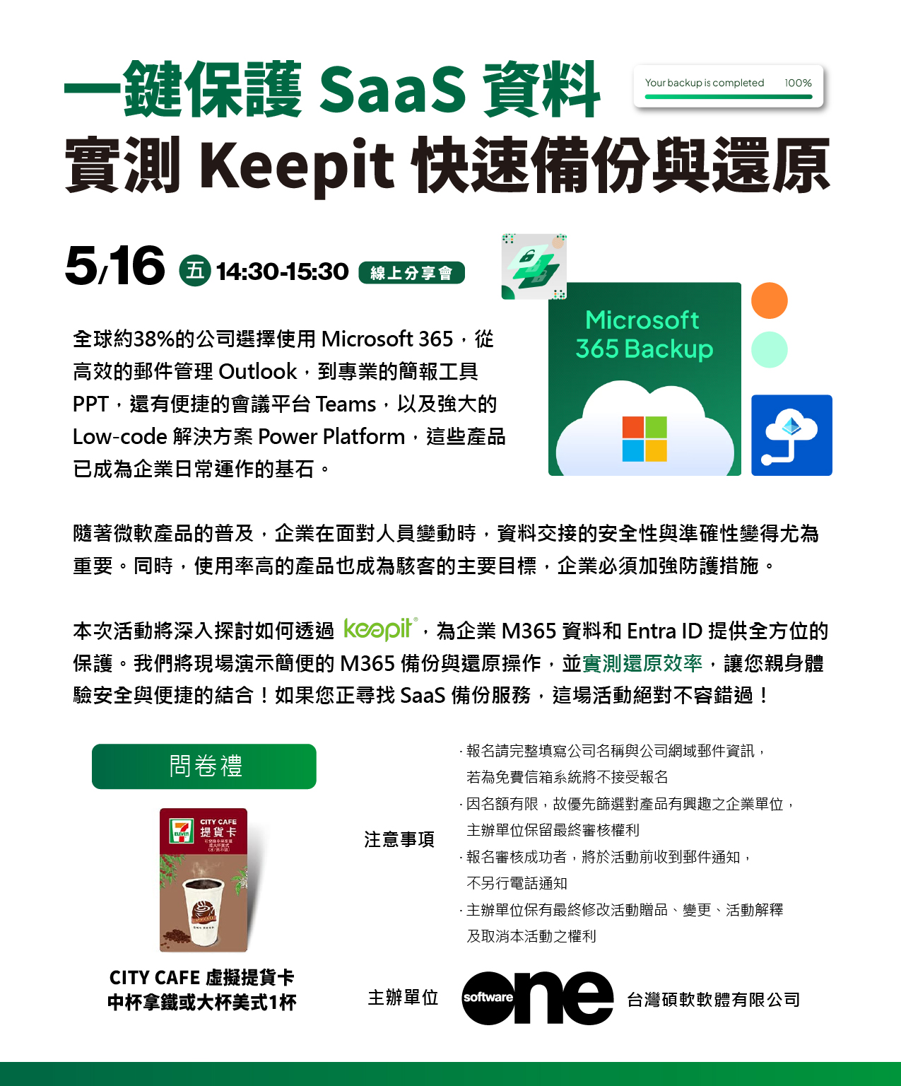 本次活動將深入探討如何透過 Keepit,為企業 M365 資料和 Entra ID 提供全方位的保護。我們將現場演示簡便的 M365 備份與還原操作,並實測還原效率,讓您親身體驗安全與便捷的結合!如果您正尋找 SaaS 備份服務,這場活動絕對不容錯過!