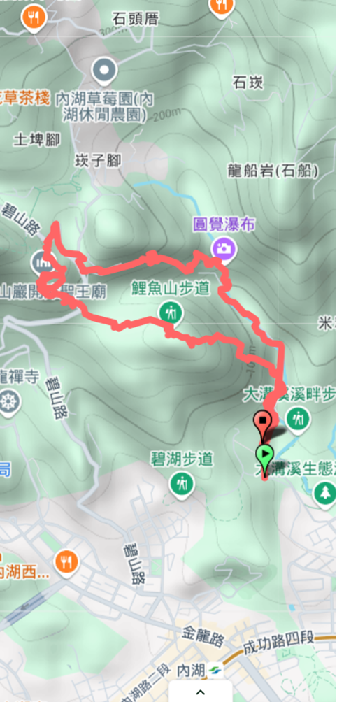 終點:鯉魚山登山口 → 可選擇走向碧山巖方向,接成功路搭乘公車返回內湖捷運站