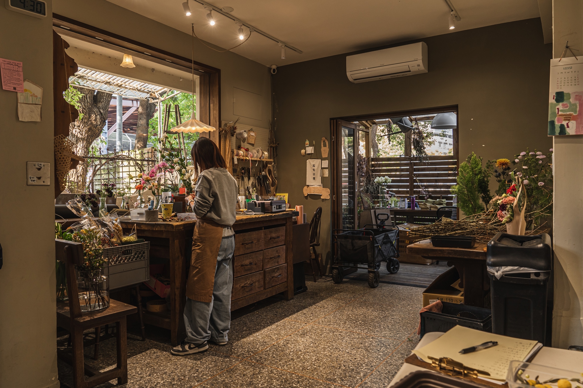 花,是無聲且深具情感的語言,不僅裝點空間,更是情感的橋樑。在「三輪車花店」的旅程中,凱葳帶著花走進街區,創造花與人相遇的契機,讓器物在流轉中承載故事,也讓都市的一隅因花而柔軟。這份對日常美學的探索,最終落腳於南屯黎明新村,老宅與花藝的交融,使這座花宅不僅是一間花店,更成為記憶與情感交織的溫暖所在。