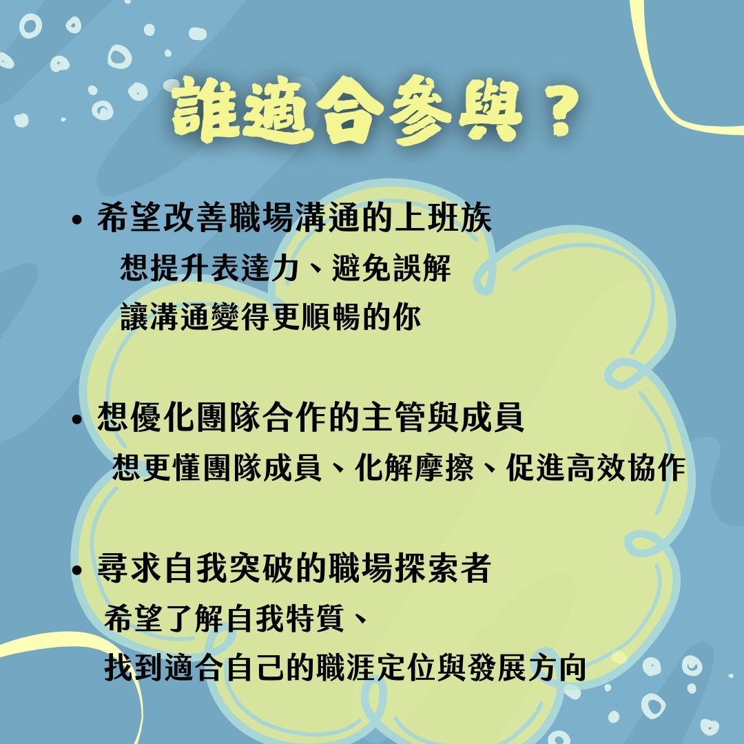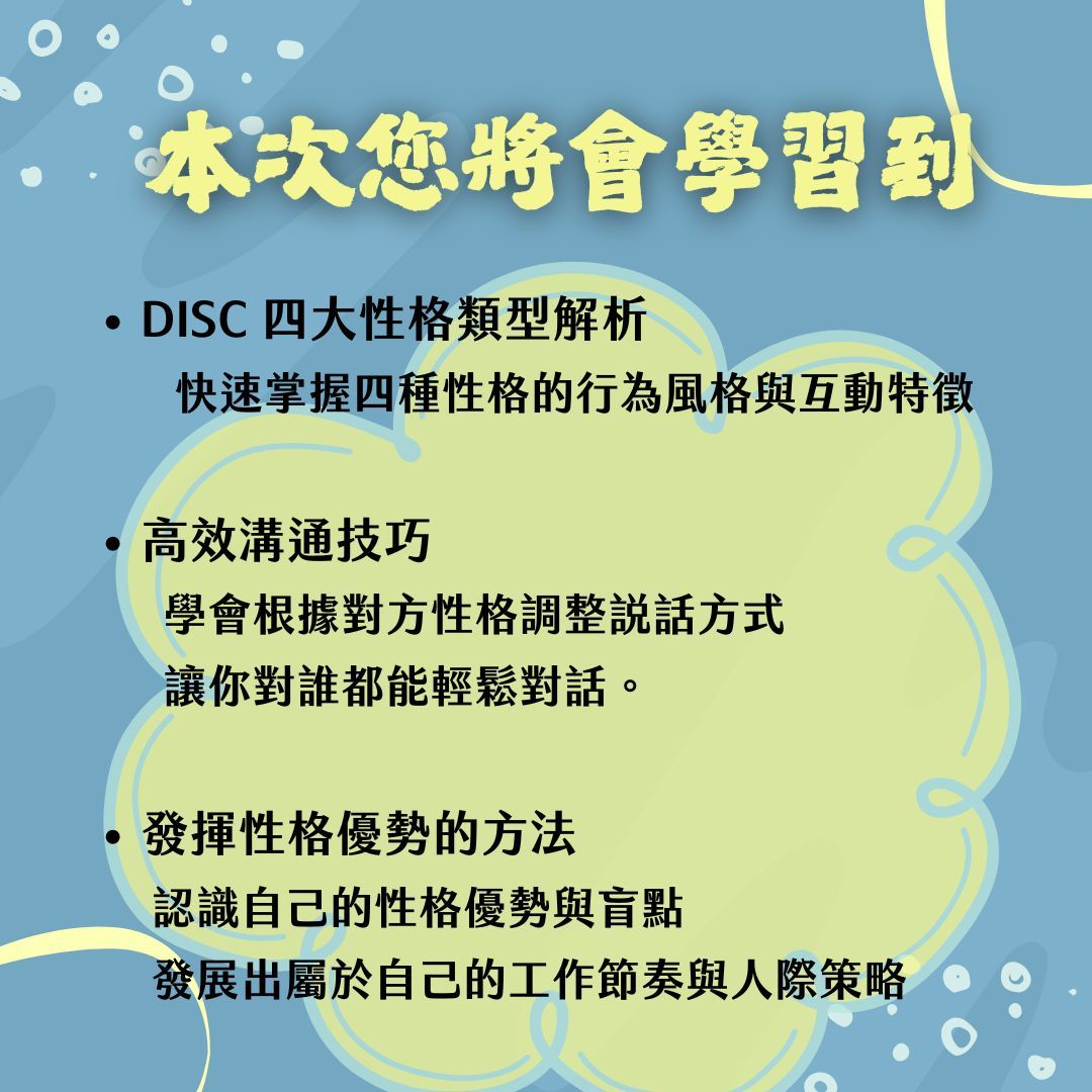 📊 DISC 是一套簡單又實用的性格分析工具,能幫助你快速了解自己與他人的行為模式,從而提升溝通力與協作力。透過 DISC,你可以: