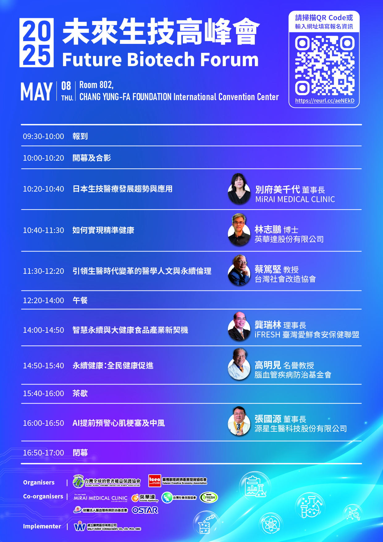 在全球生技與醫療產業快速變革的時代,「2025未來生技高峰會」以「科技創新、生技投資與永續發展」為核心,聚焦人工智能(AI)醫療、精準健康、綠色生技等前沿領域,探討產業轉型、科技應用與市場發展趨勢,邀集全球頂尖專家、學者、企業領袖及投資人,共同剖析生技創新的機遇與挑戰,推動跨領域合作,促進技術落地與商業化。本次高峰會涵蓋專題演講、案例分享,邀請來自產官學研界的領袖共同探討技術應用、市場需求與政策法規等關鍵議題。透過多元視角的碰撞,與會者將能夠深入了解如何將前沿科技從實驗室帶入市場,並挖掘產業未來的投資機會。