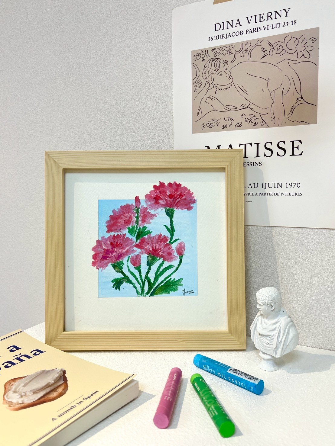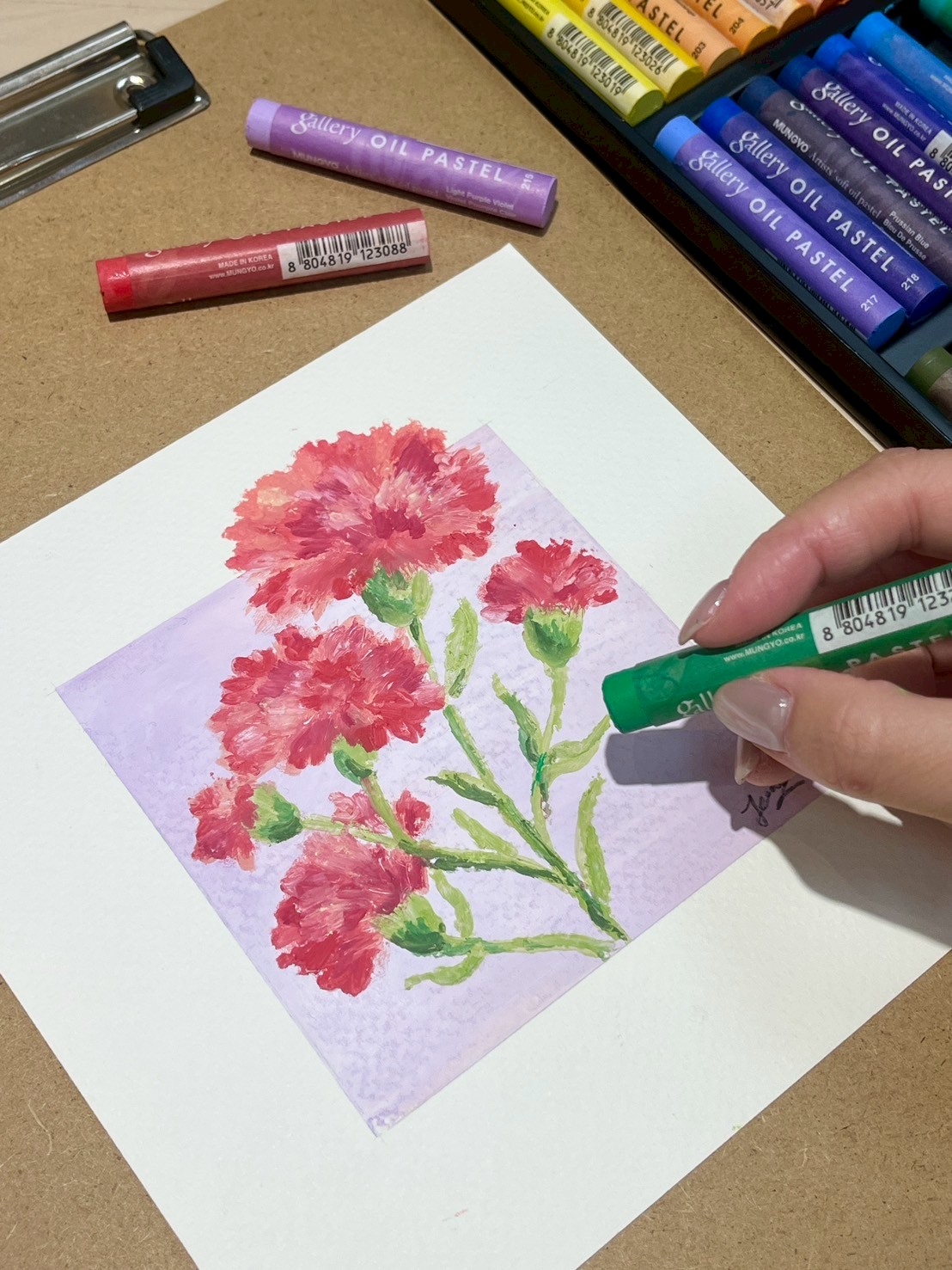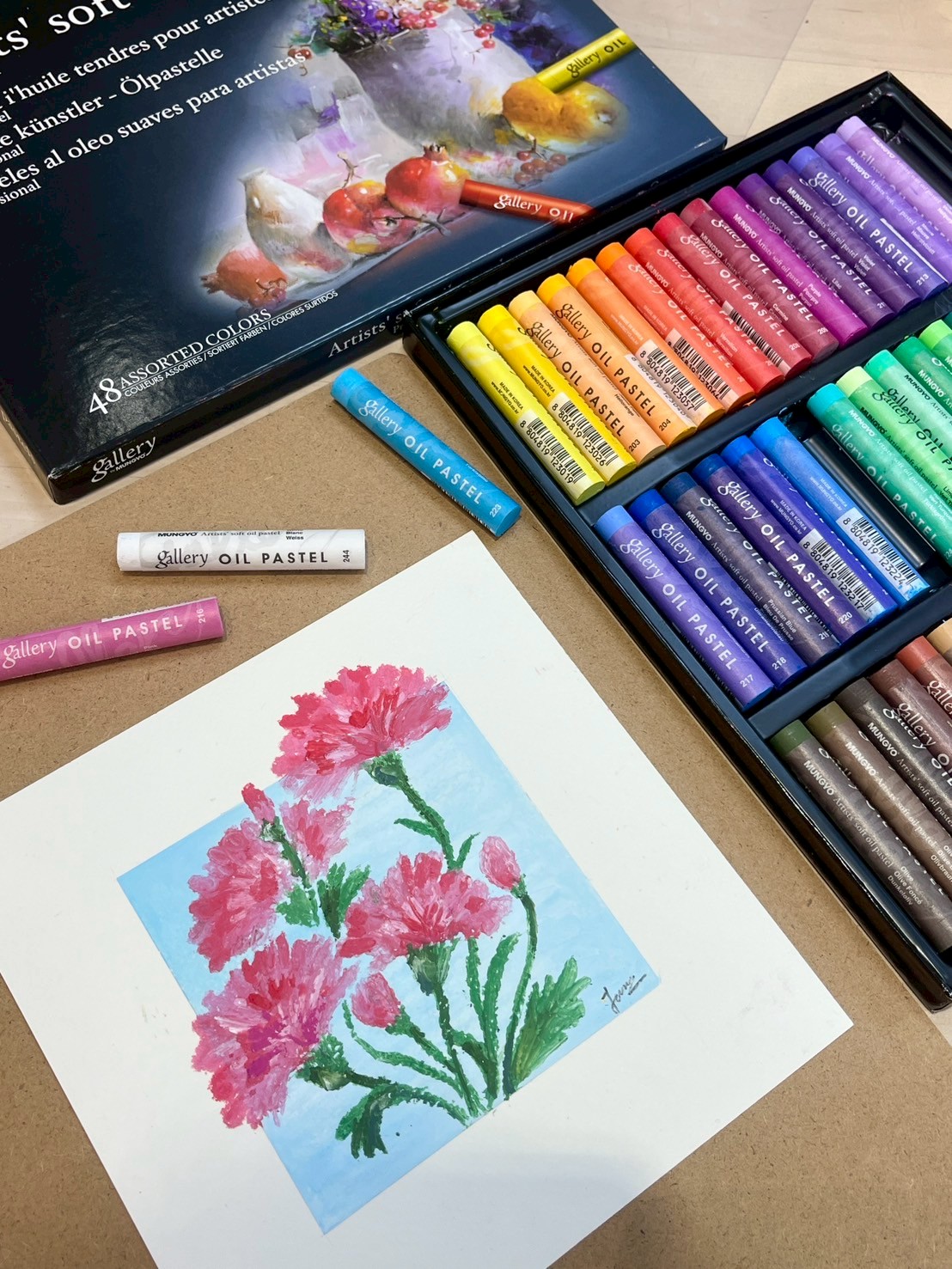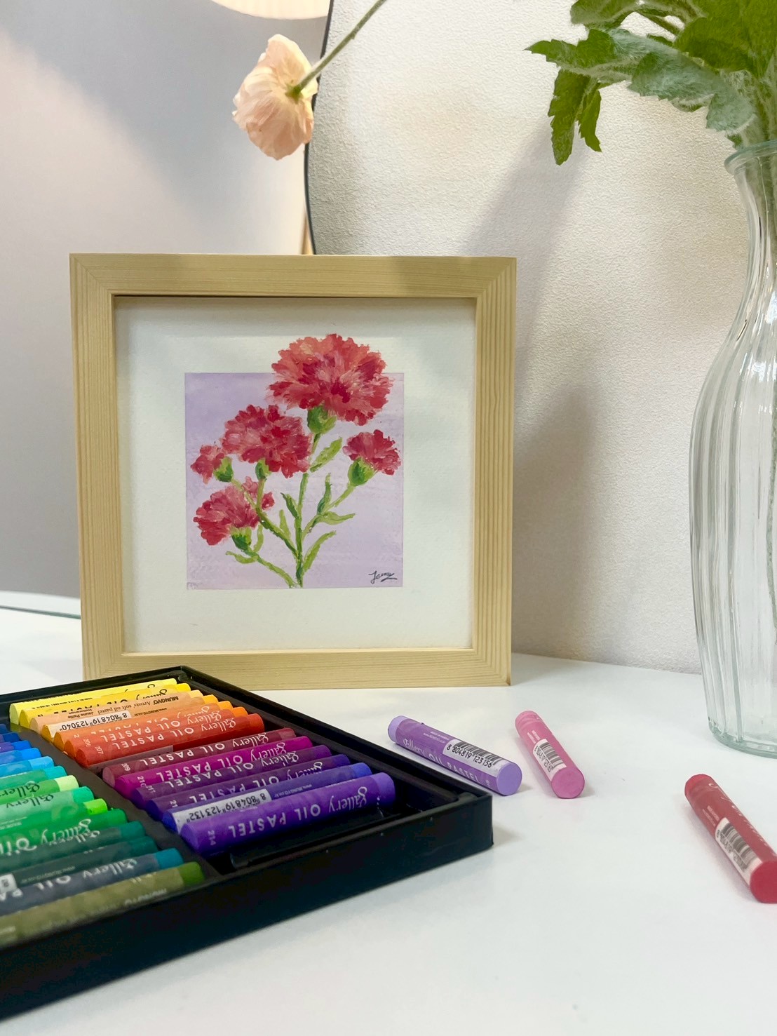 這堂課將帶你用油畫棒描繪出溫柔、有層次的康乃馨花束,