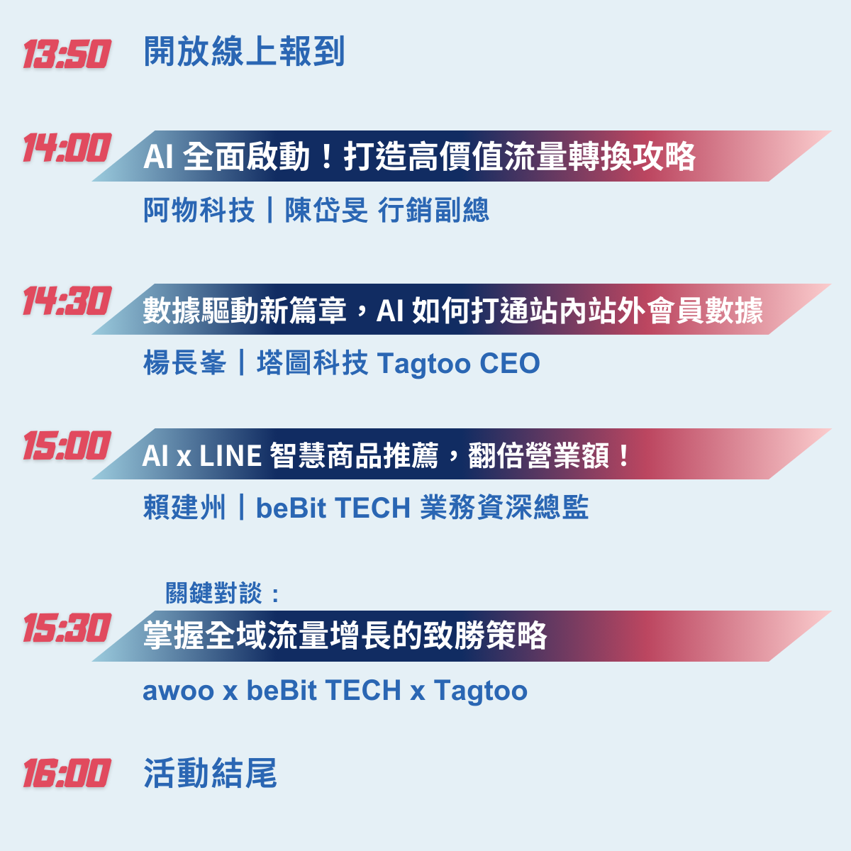 本場分享將深入探討如何運用 MarTech 科技、廣告技術與 AI 搜尋等佈局流量與轉換優化策略,並提升精準成效,同時串連全渠道數據強化會員經營,帶領品牌掌握全域流量增長的關鍵策略,在激烈競爭品牌戰中脫穎而出!