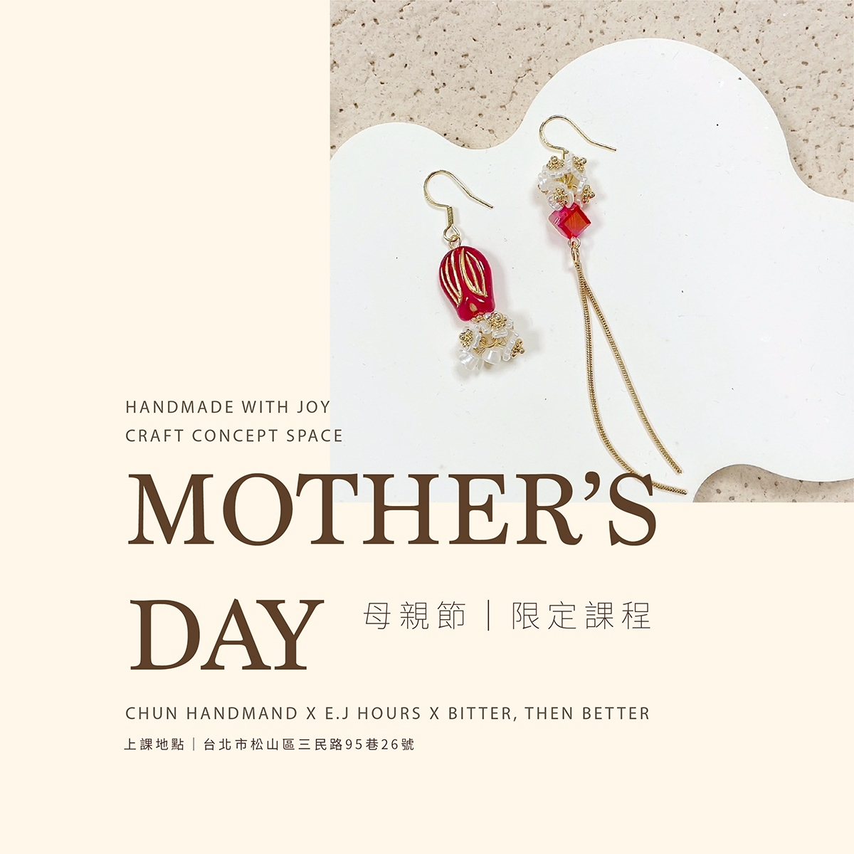 母親從小細心呵護著我們,如今也希望有天能為她付出。這份真摯的情感,用手作的溫度打造出一付專屬於母親的耳環。