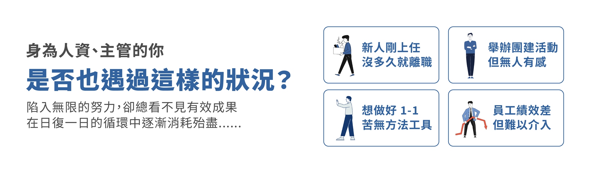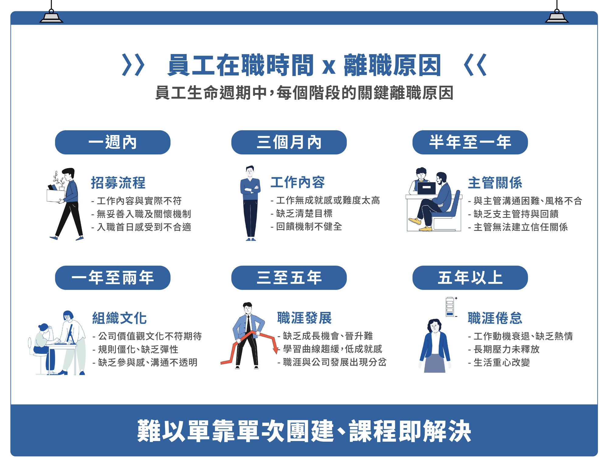 而員工的離職原因,在入職後的不同階段,會受到各項因素所著重影響,不僅與企業結構性因素有所關聯,也與日常的管理、溝通模式有關,因此往往難以單靠單次性的 Team Building 團隊建立,或是單場培訓課程即可解決。