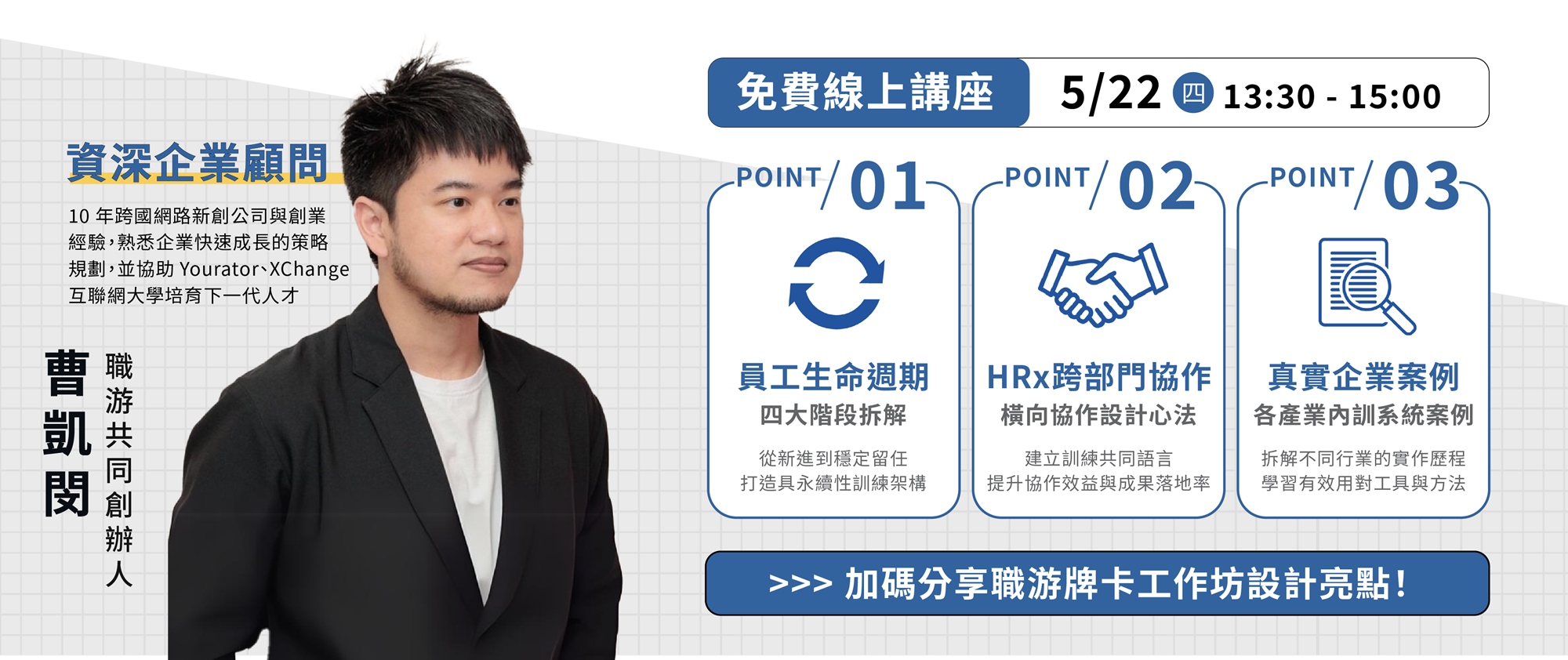 這場講座,正是為了回應這些內訓設計的核心挑戰,帶你從全局思維出發,看懂訓練設計的「全生命週期」。