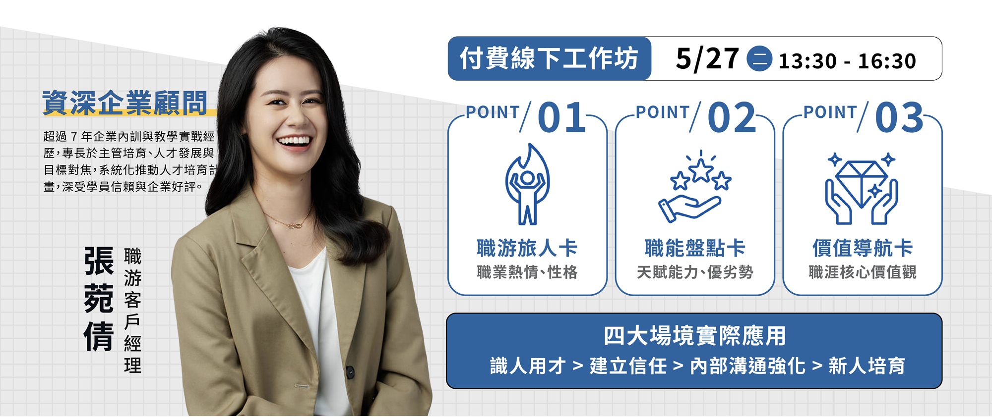從實習、新人訓練,到主管輔導與轉調晤談,我們將完整呈現職游如何協助企業打造一套「內部訓練的共通語言」與「可複製流程」,幫助 HR 與主管在每個環節都能說對話、做對事。