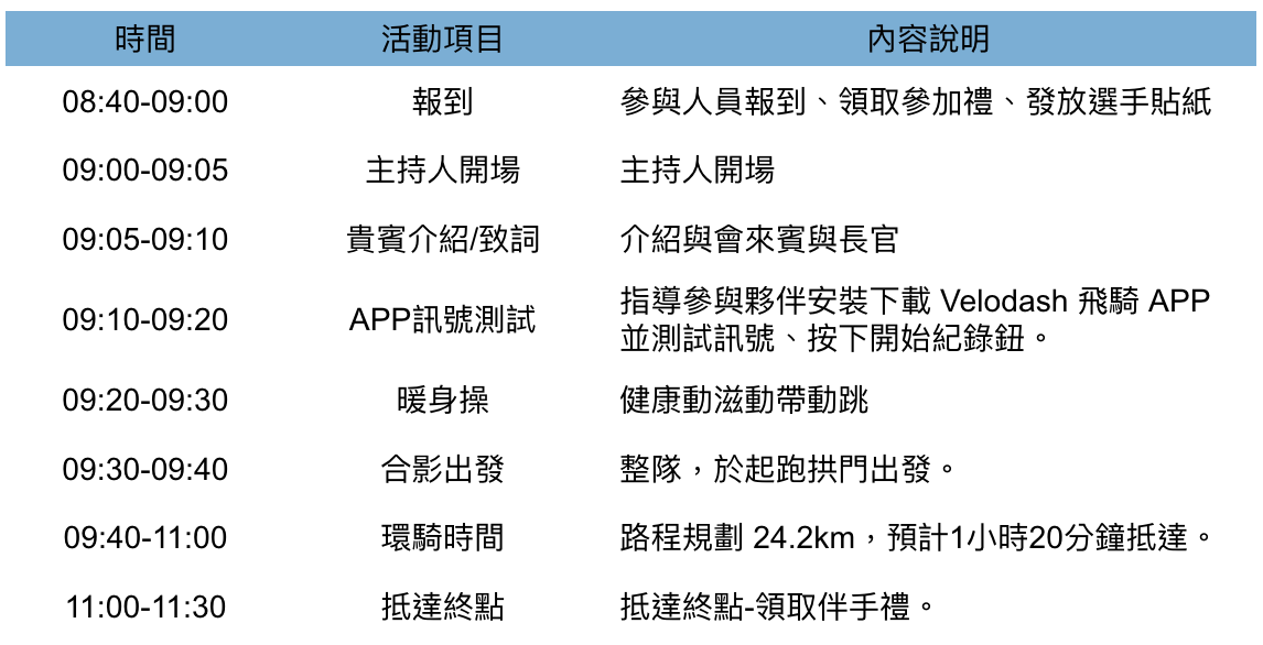 - 為確保活動順利進行,請於活動當日安裝 𝗩𝗲𝗹𝗼𝗱𝗮𝘀𝗵 𝗔𝗣𝗣 以紀錄騎乘軌跡。建議提前完成安裝,以避免當天因網路狀況不穩而影響使用。