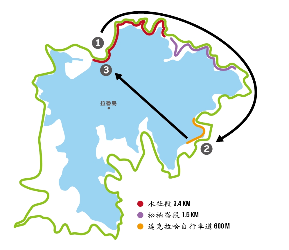 路線:水社中興停車場服務台報到→水社商圈合作車店(自行取車)→水社碼頭集合→水社段→朝霧碼頭→文武廟→松柏崙段→伊達邵碼頭→達克拉哈水上自行車道→日月潭纜車站→伊達邵碼頭(人車上船)→終點水社碼頭(自行還車)