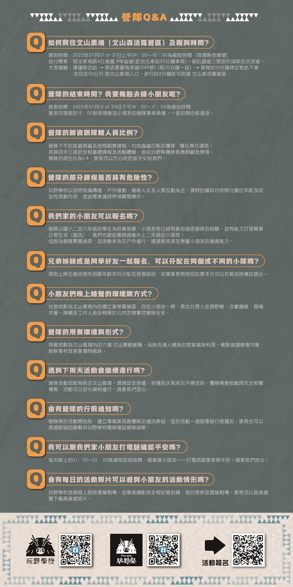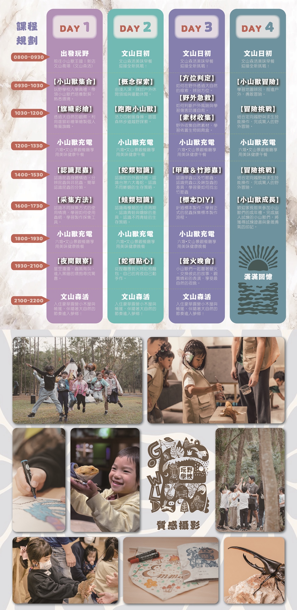 一. 玩野學校小山獸招募國小二年級至六年級學童,請透過網路連結報名。 因應氣候、場地等變化,主辦單位保有活動內容取消或變更之權利。四天三夜課程內容及詳細報名資訊可透過官方粉專及IG洽詢。
